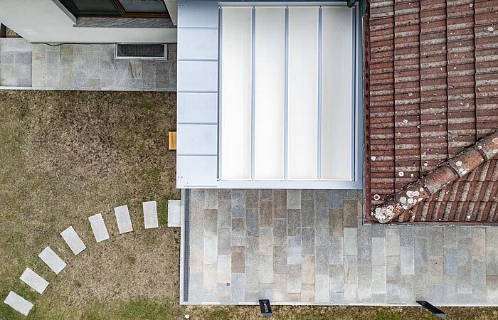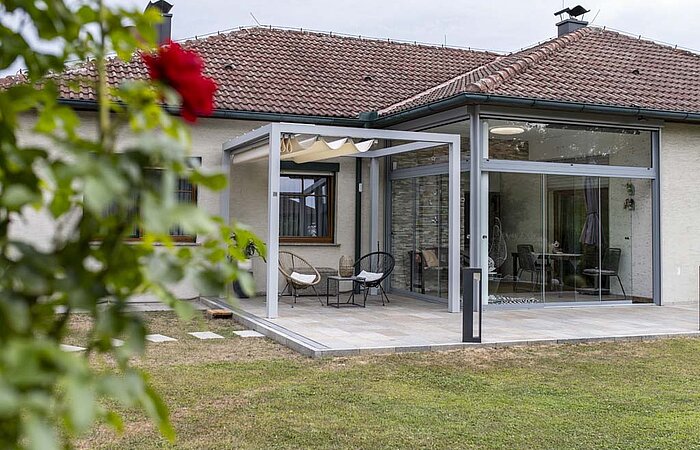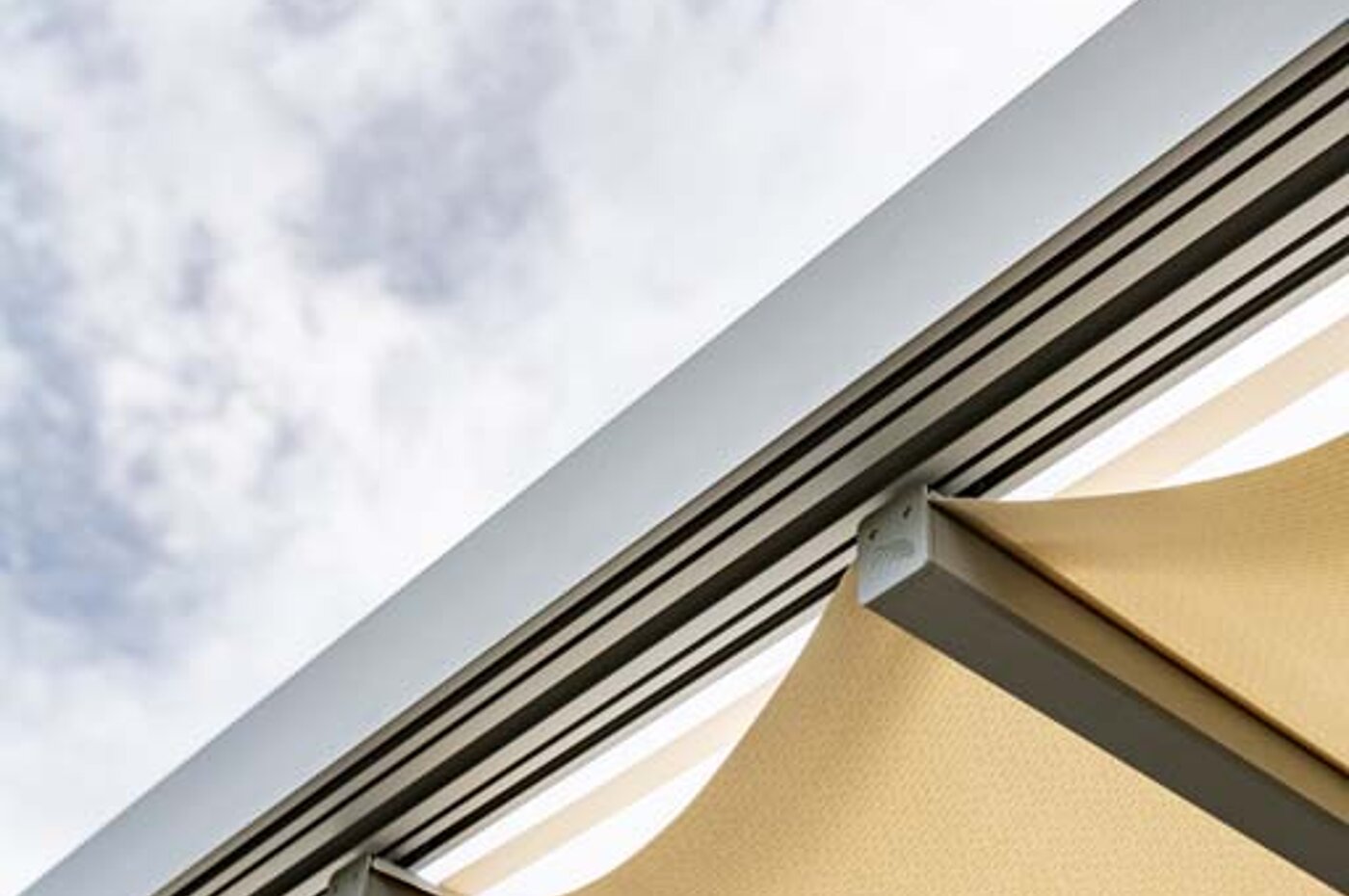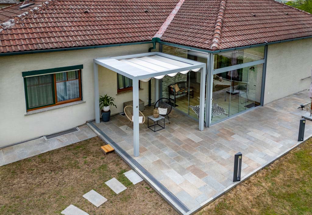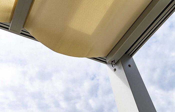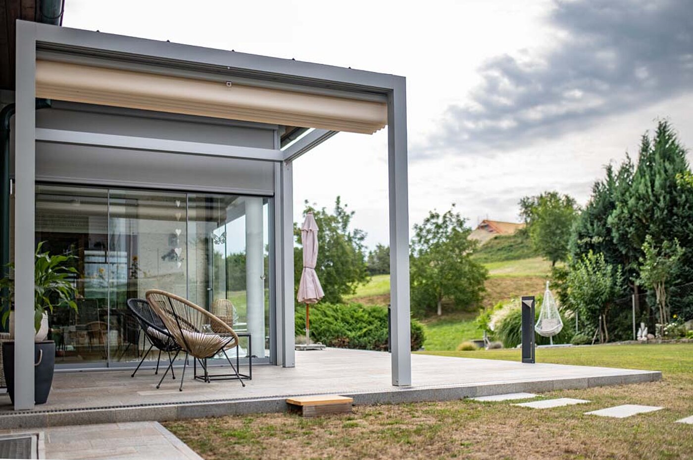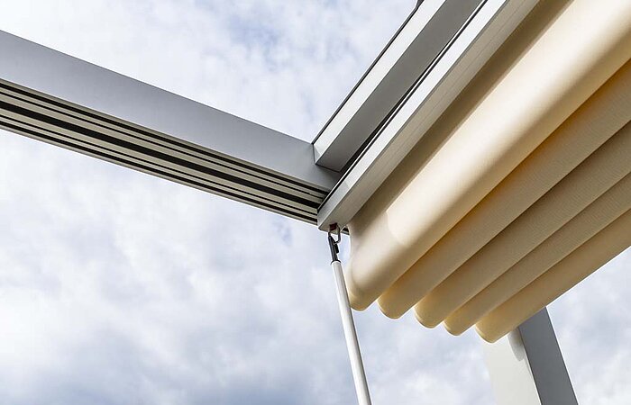 Bei der manuell bedienbaren Faltmarkise Light liegt der Markisenstoff im Gefälle, so wird das Regenwasser einseitig abgeleitet. Seitlich kann ein Rollo zusätzlich als Sonnenschutz dienen.