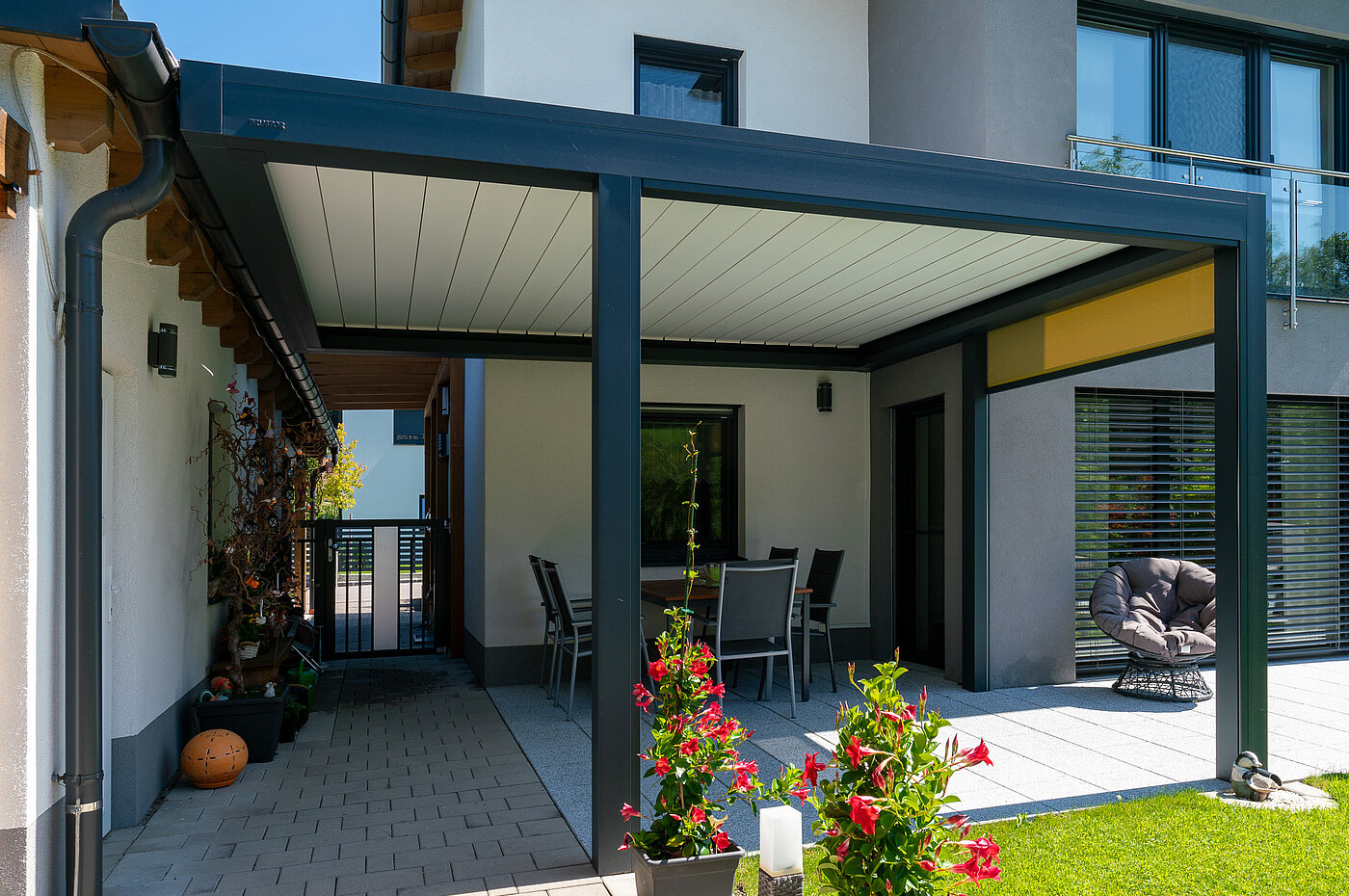 Das Lamellendach wird an die bestehende Hauswand montiert und passt sich perfekt dem Bestand an.