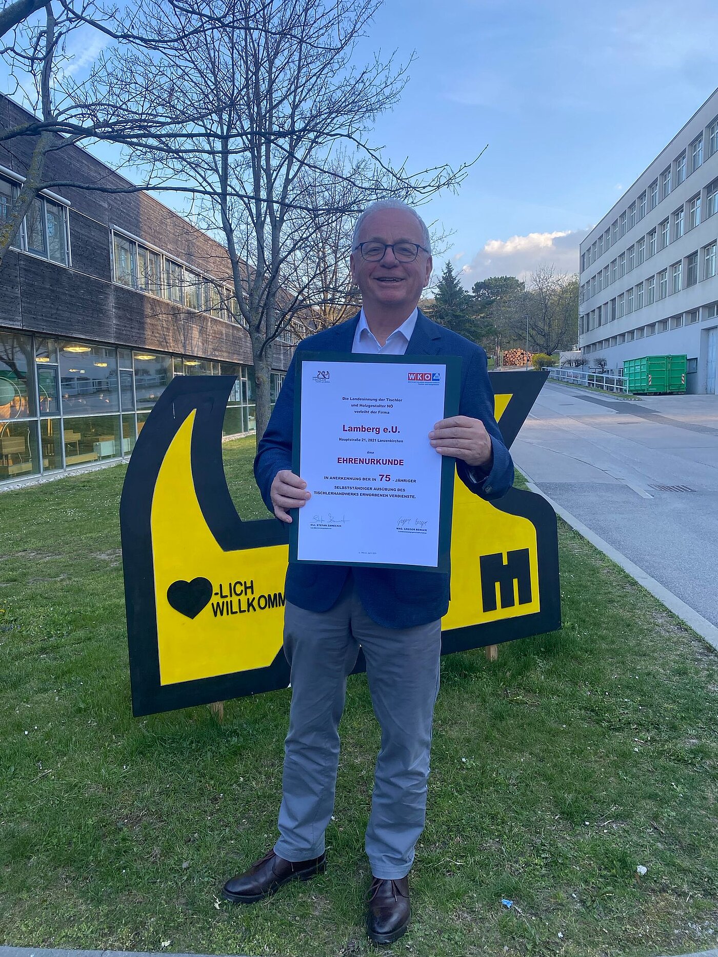 Die Landesinnung der Tischler und Holzgestalter NÖ verleiht Rudolf Lamberg “Junior” die Ehrenurkunde zum 75. jährigen Firmenjubiläum.