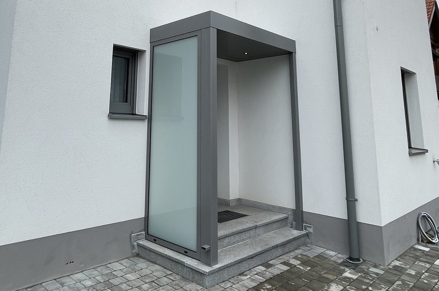 Mit integrierter Regenrinne, Beleuchtung und wählbaren Seitenteilen aus Glas, Alu-Paneel oder Sprossen bieten die Vordächer optimalen Sonnen-, Wind- und Regenschutz. Sie sind bis zu 400 cm breit und 180 cm tief – die ideale Visitenkarte für Ihr Zuhause.