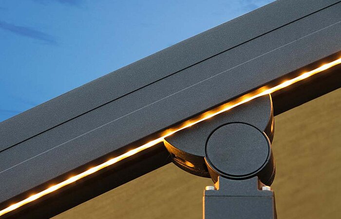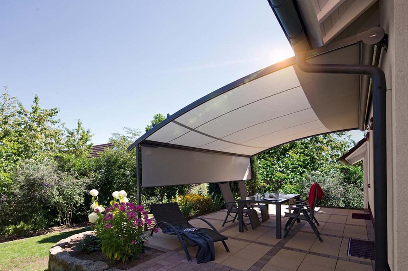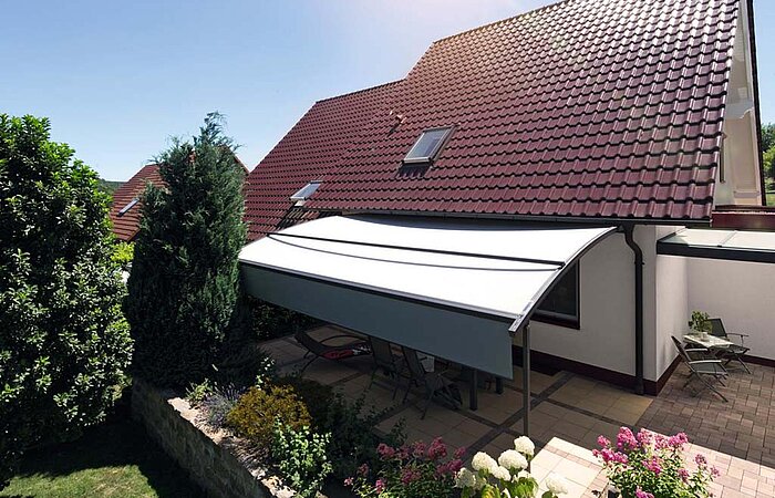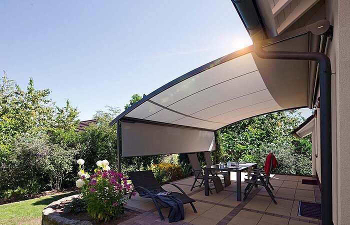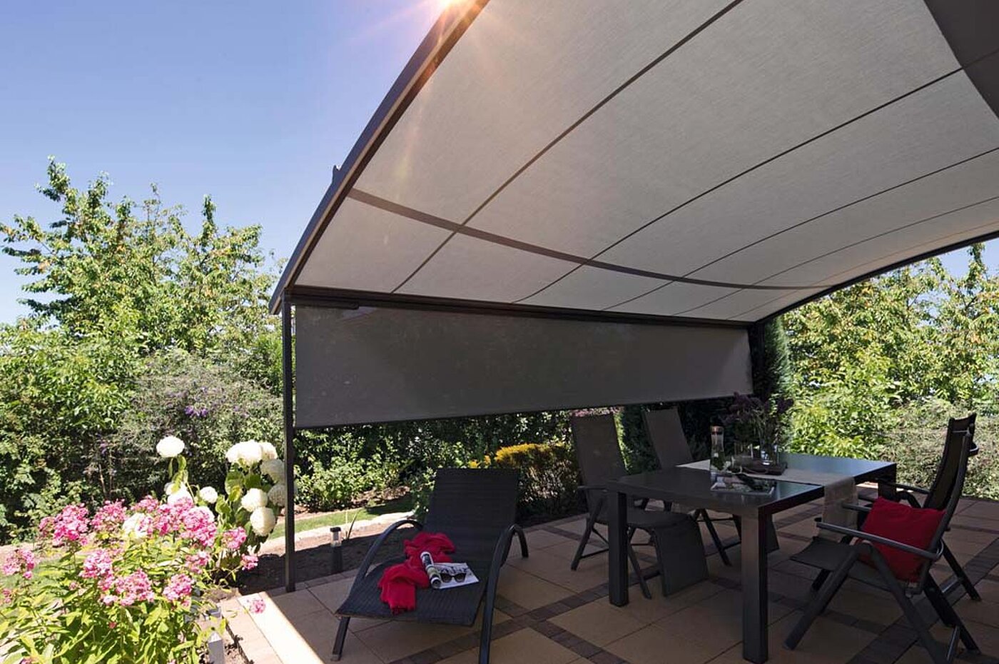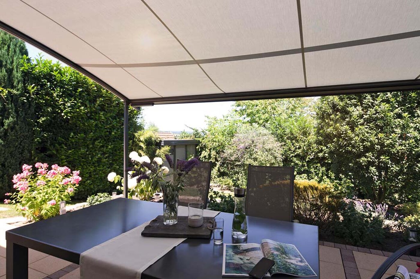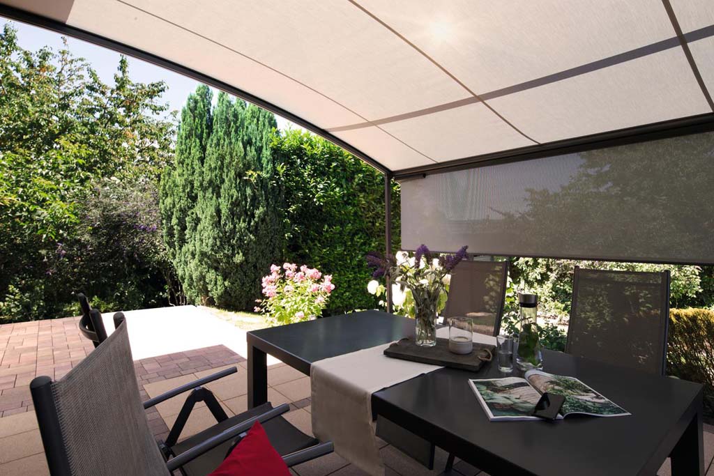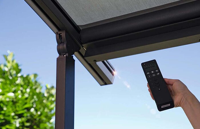 Pergolamarkisen mit Funkmotor und Windsensor sind für Windgeschwindigkeiten bis 48 km/h gebaut. Die Stoffe sind regenabweisend.