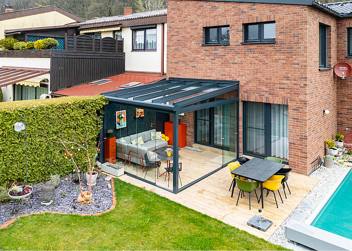 Vom Frühjahr bis in den Herbst naturnah wohnen und die Terrasse bei jedem Wetter nützen.
