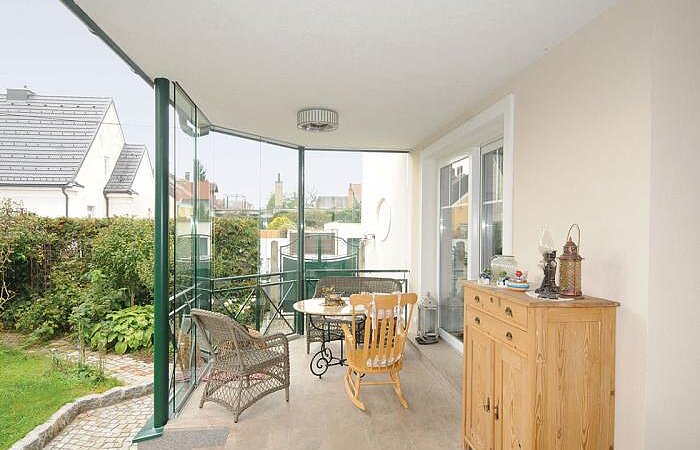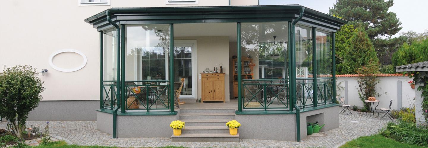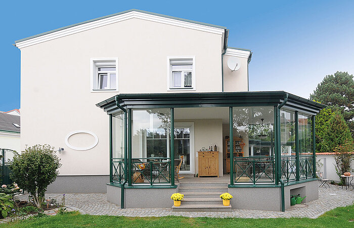 An ein zweigeschossiges Haus wurde an Stelle der alten Holzterrasse ein Massiv-Sommergarten mit Flachdach errichtet. Das Dach mit Holzleimbinder wurde mit Flachdachfolie eingedeckt, die Dachuntersicht ist verputzt. Verzinkte und pulverbeschichtete Stahlsäulen tragen die Konstruktion.