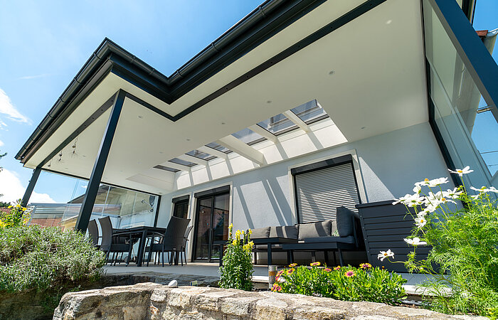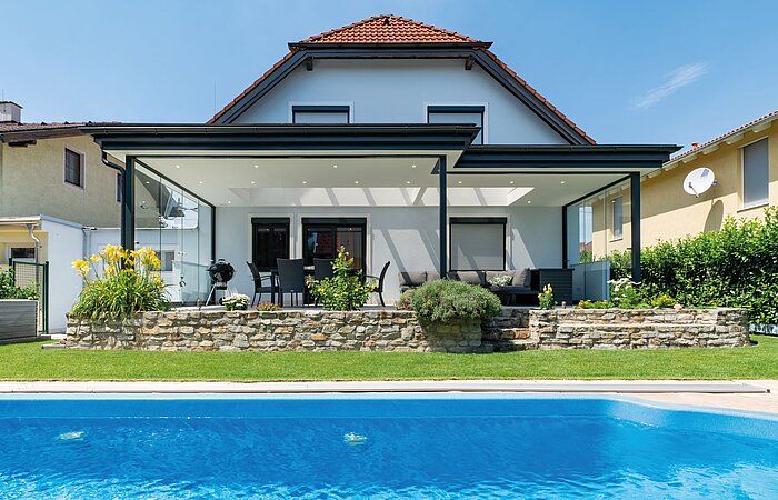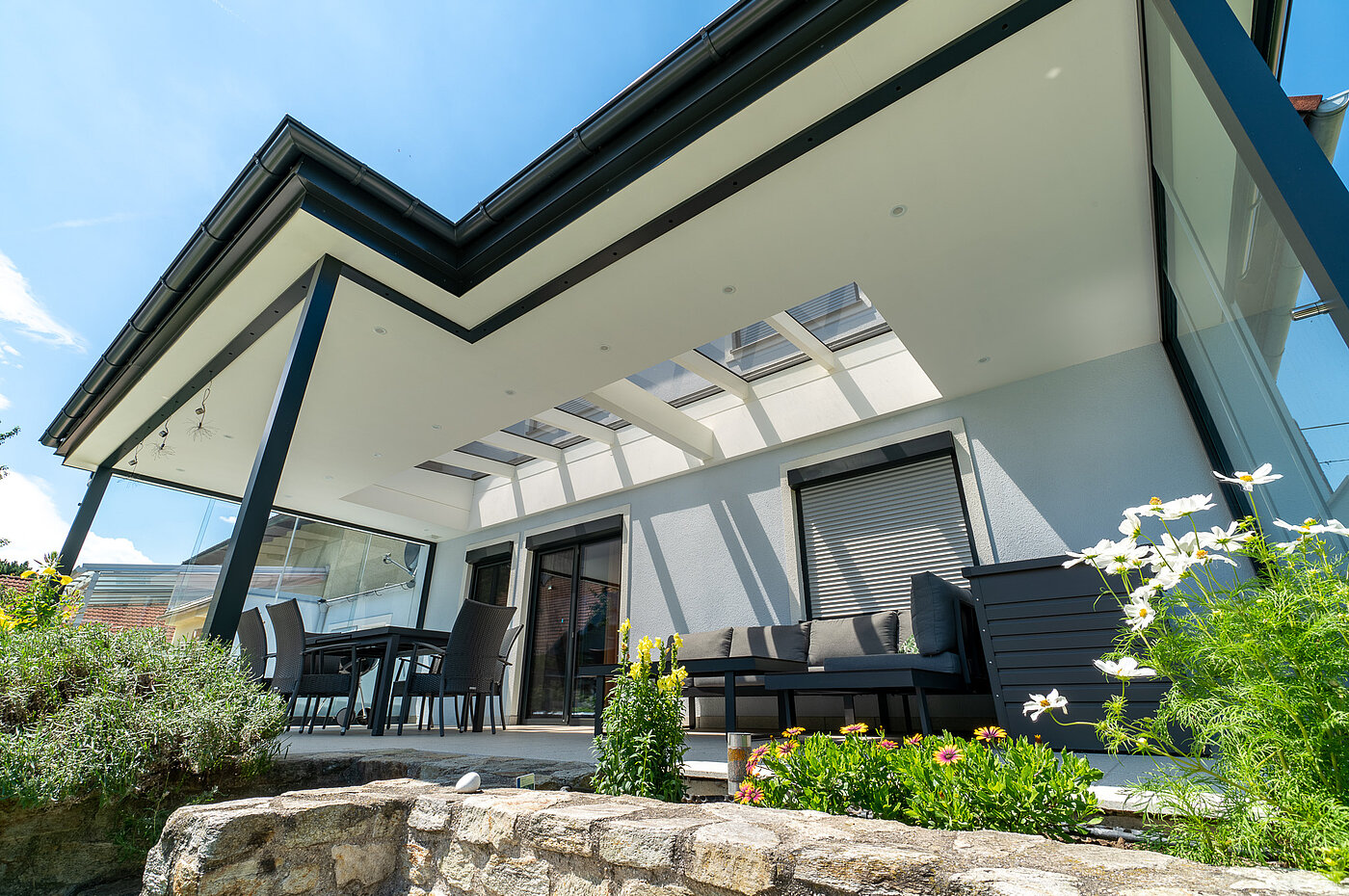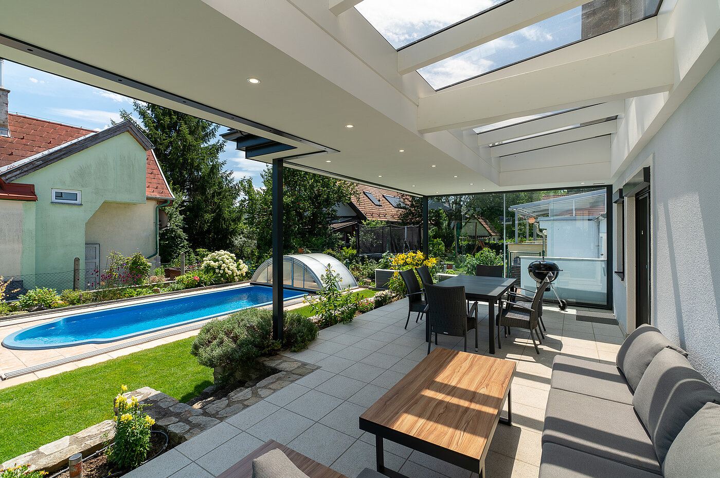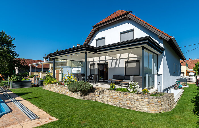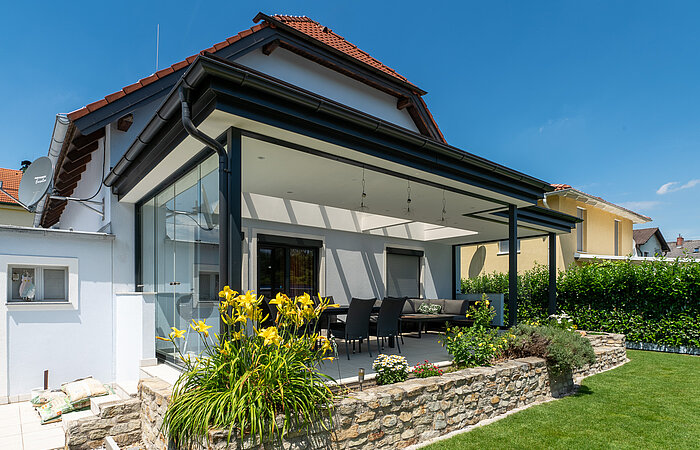 Auf einer bestehenden Terrasse wurde dieser L-förmige Sommergarten Massiv errichtet. Links und rechts bieten Gasschiebetüren ausreichenden Windschutz. Die Vorderseite kann später geschlossen werden.