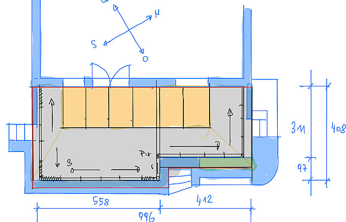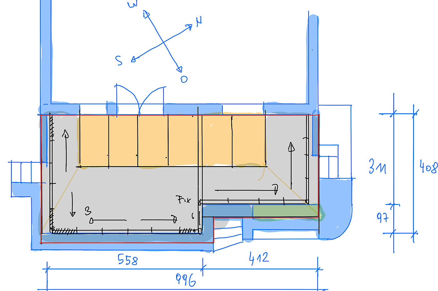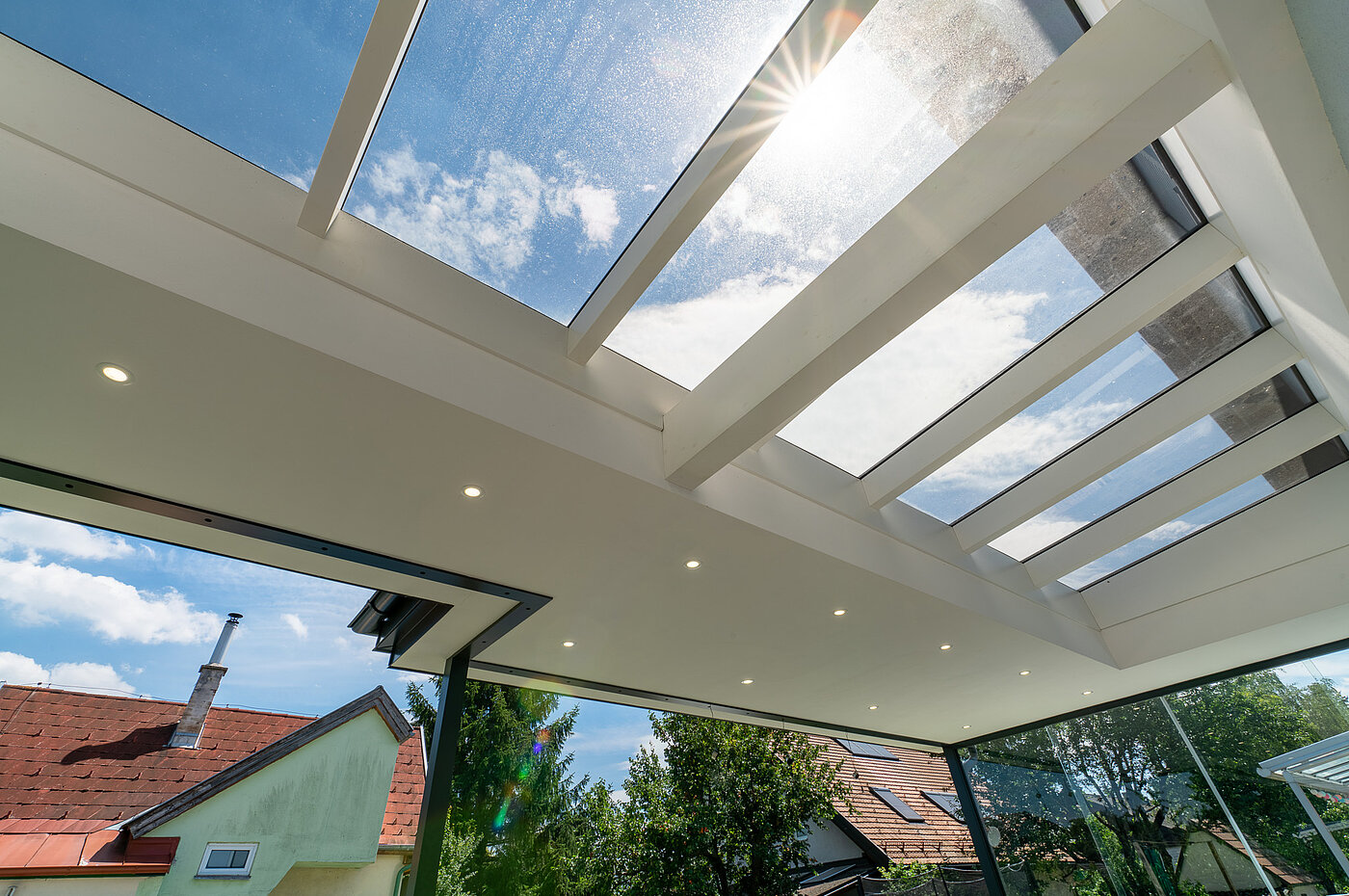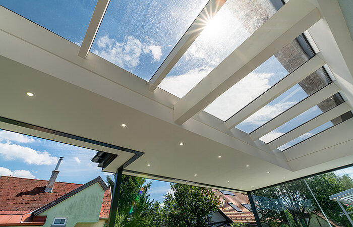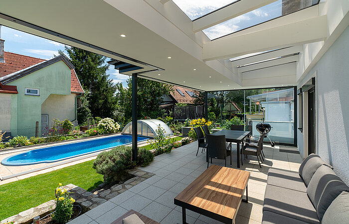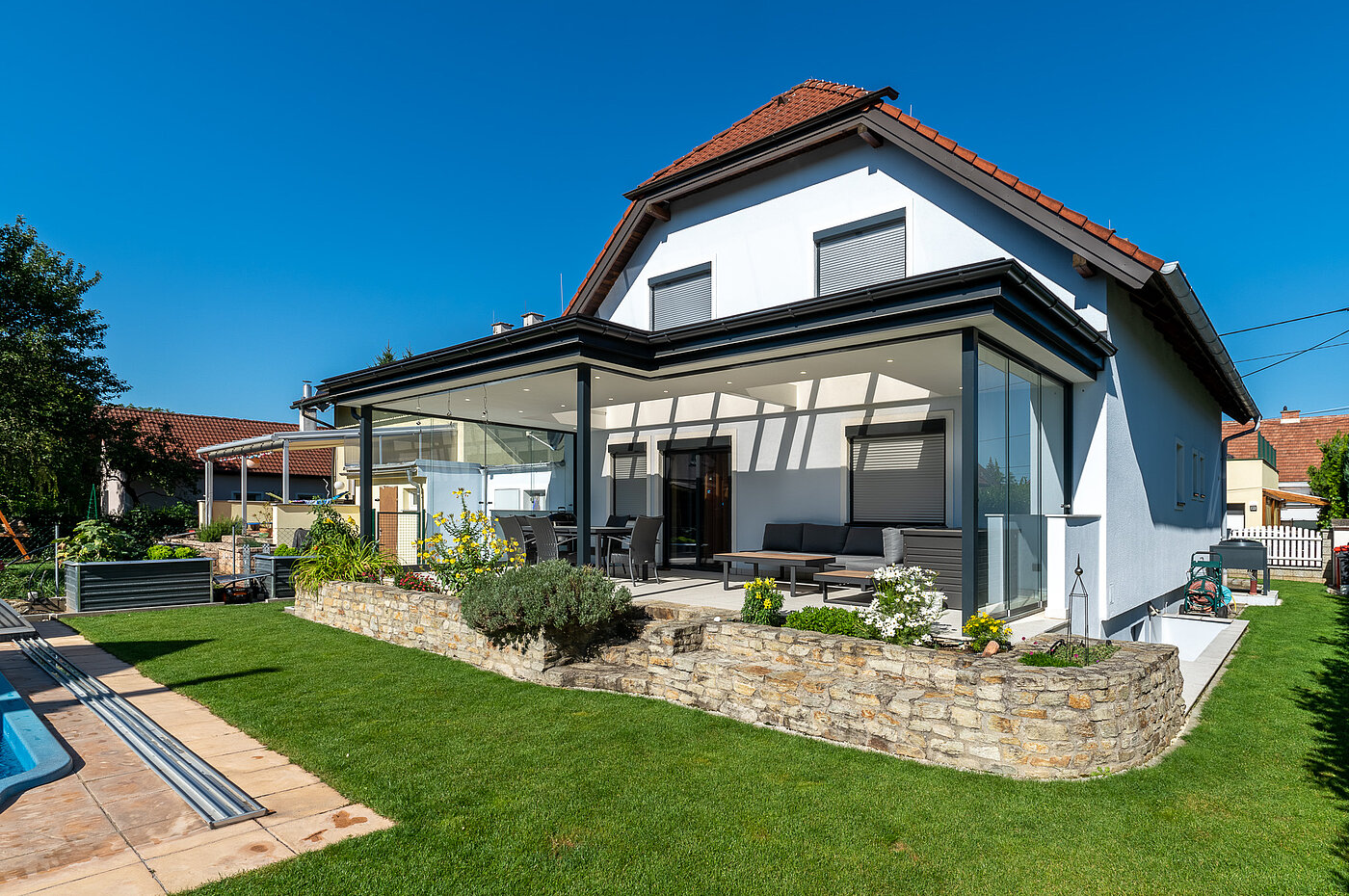 Auf einer bestehenden Terrasse wurde dieser L-förmige Sommergarten Massiv errichtet. Links und rechts bieten Gasschiebetüren ausreichenden Windschutz. Die Vorderseite kann später geschlossen werden.