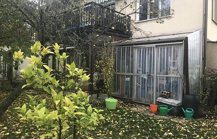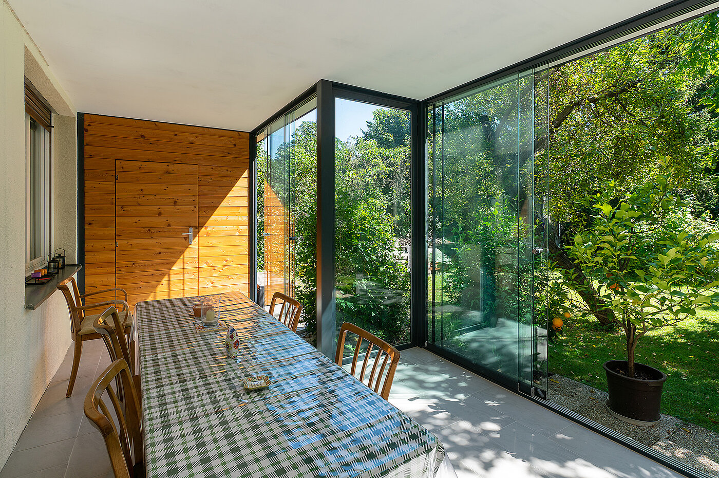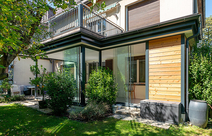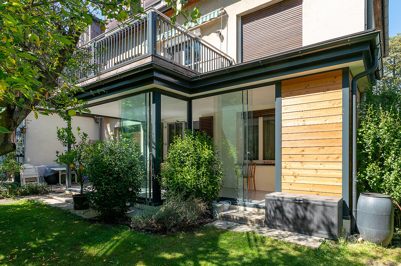 Der Massivsommergarten mit integrierter Gartenhütte und Balkon ersetzt einen renovierungsbedürftigen Holzwintergarten mit Glasanbau.
