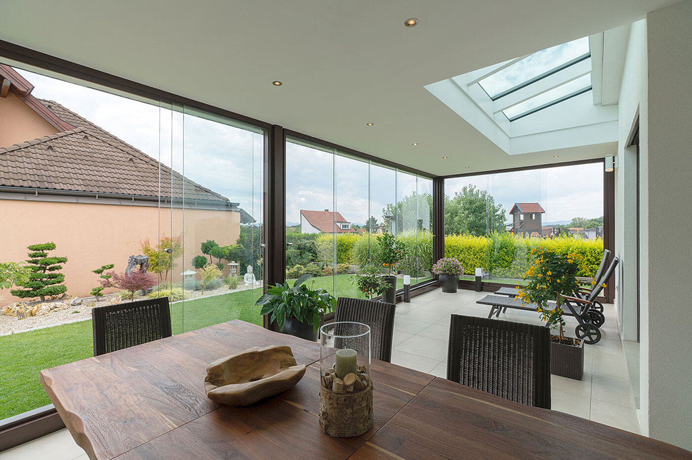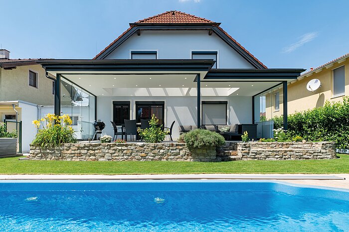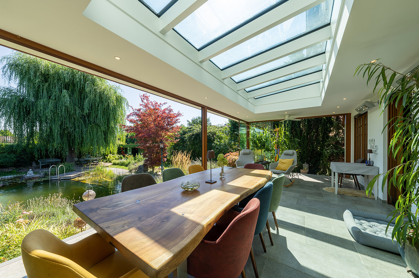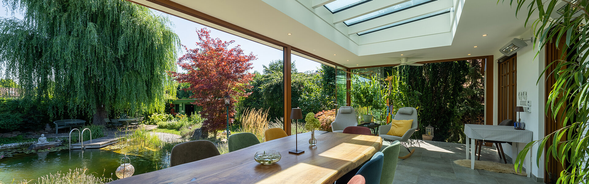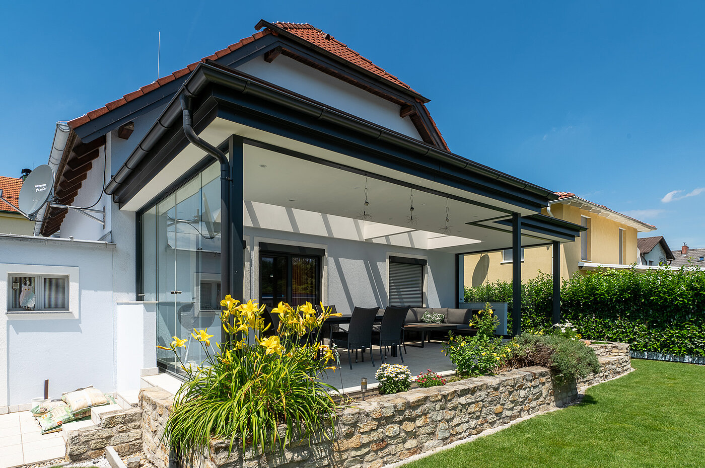 Massivdach mit optimalem Sonnenschutz und transparenter Sicht in den Garten.