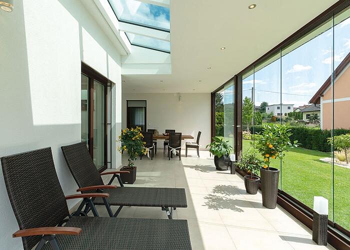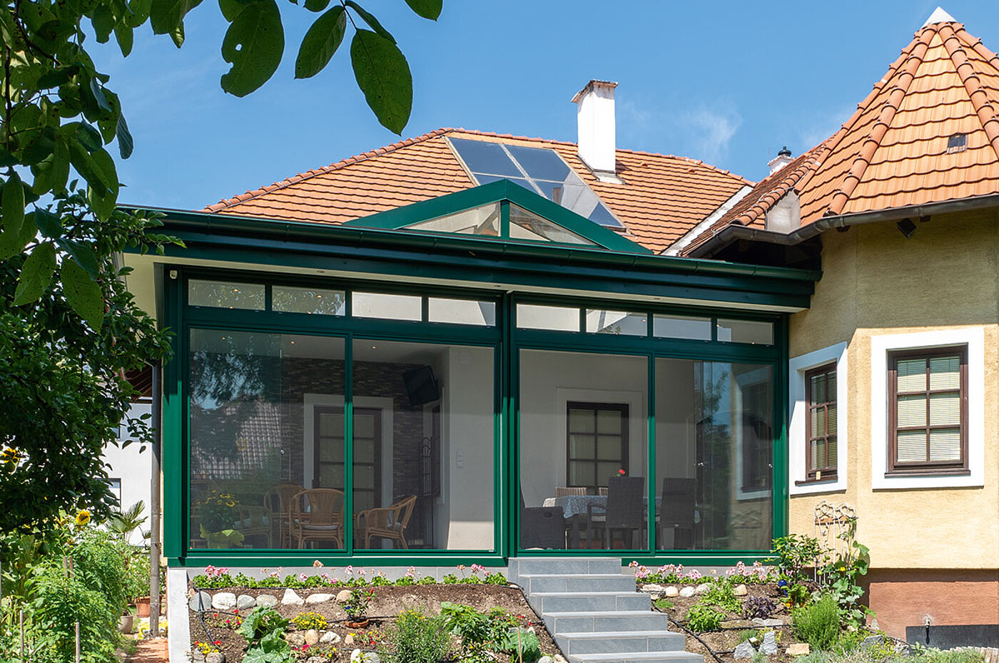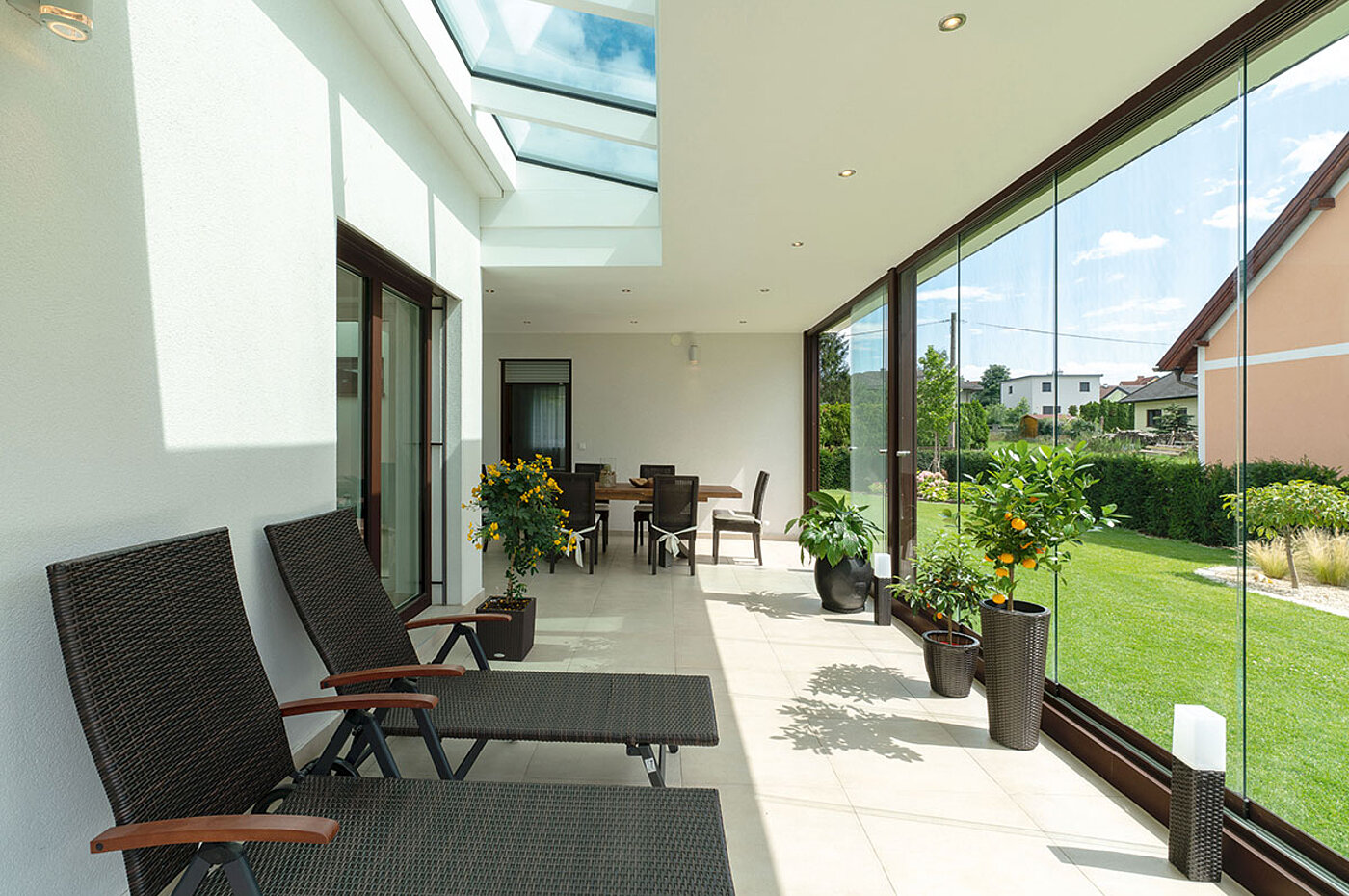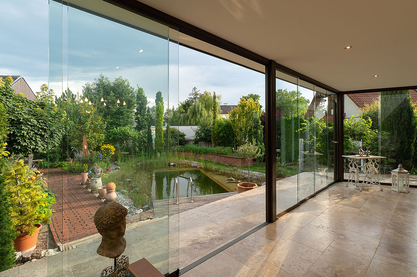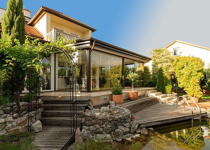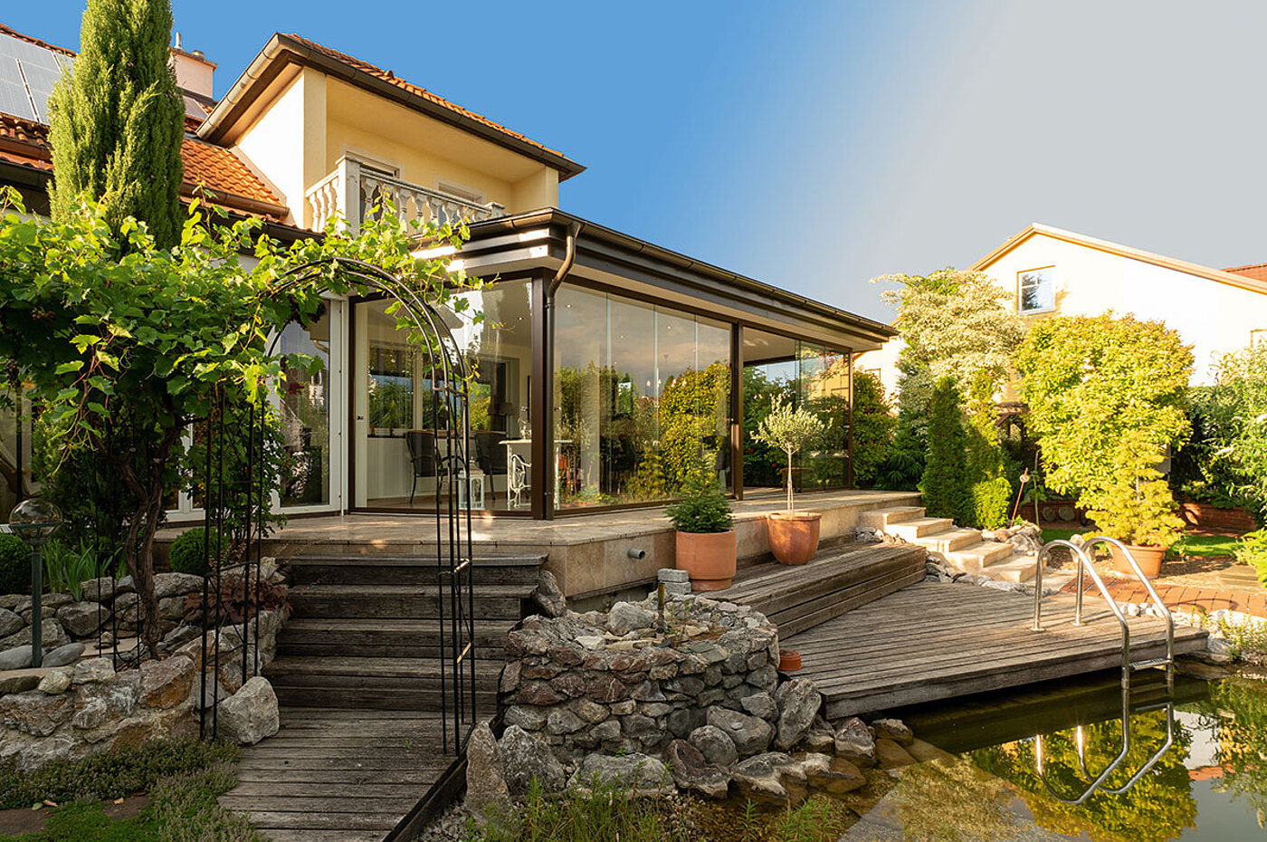 Massivdach mit optimalem Sonnenschutz und transparenter Sicht in den Garten.