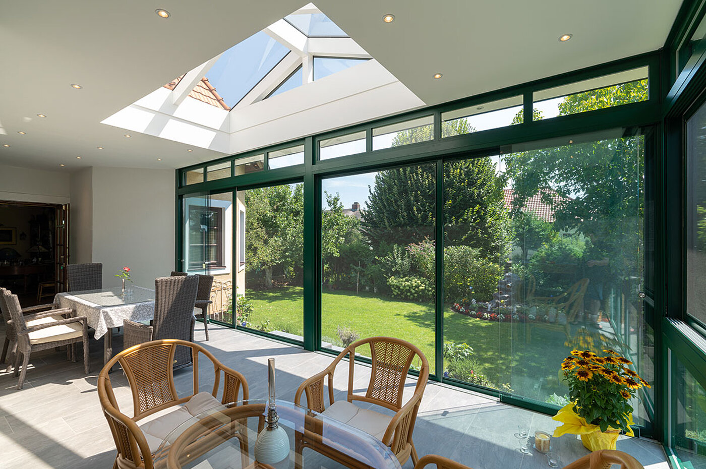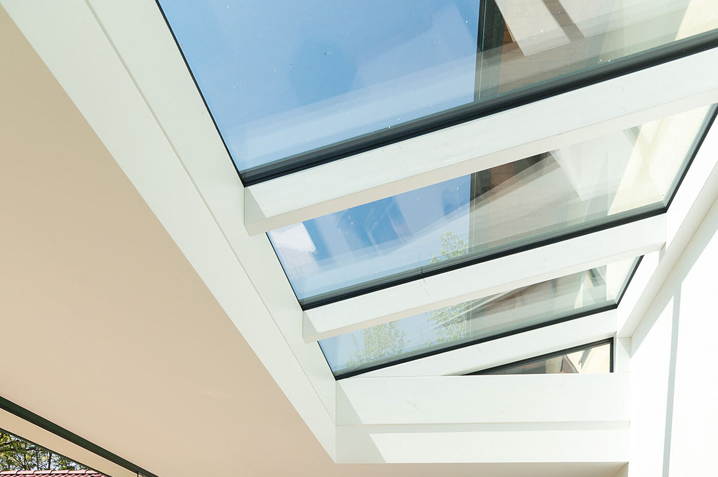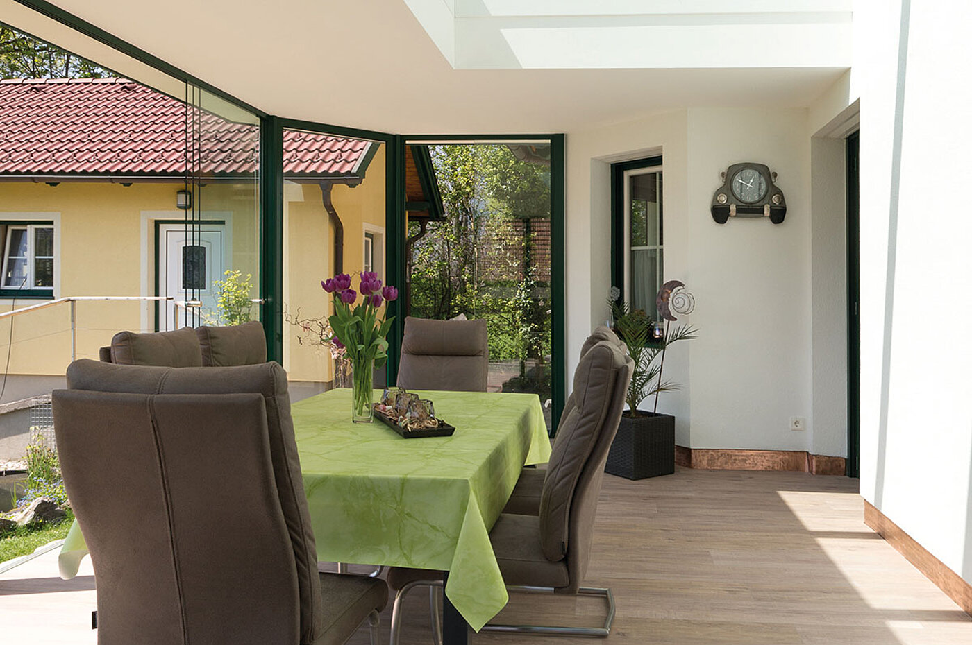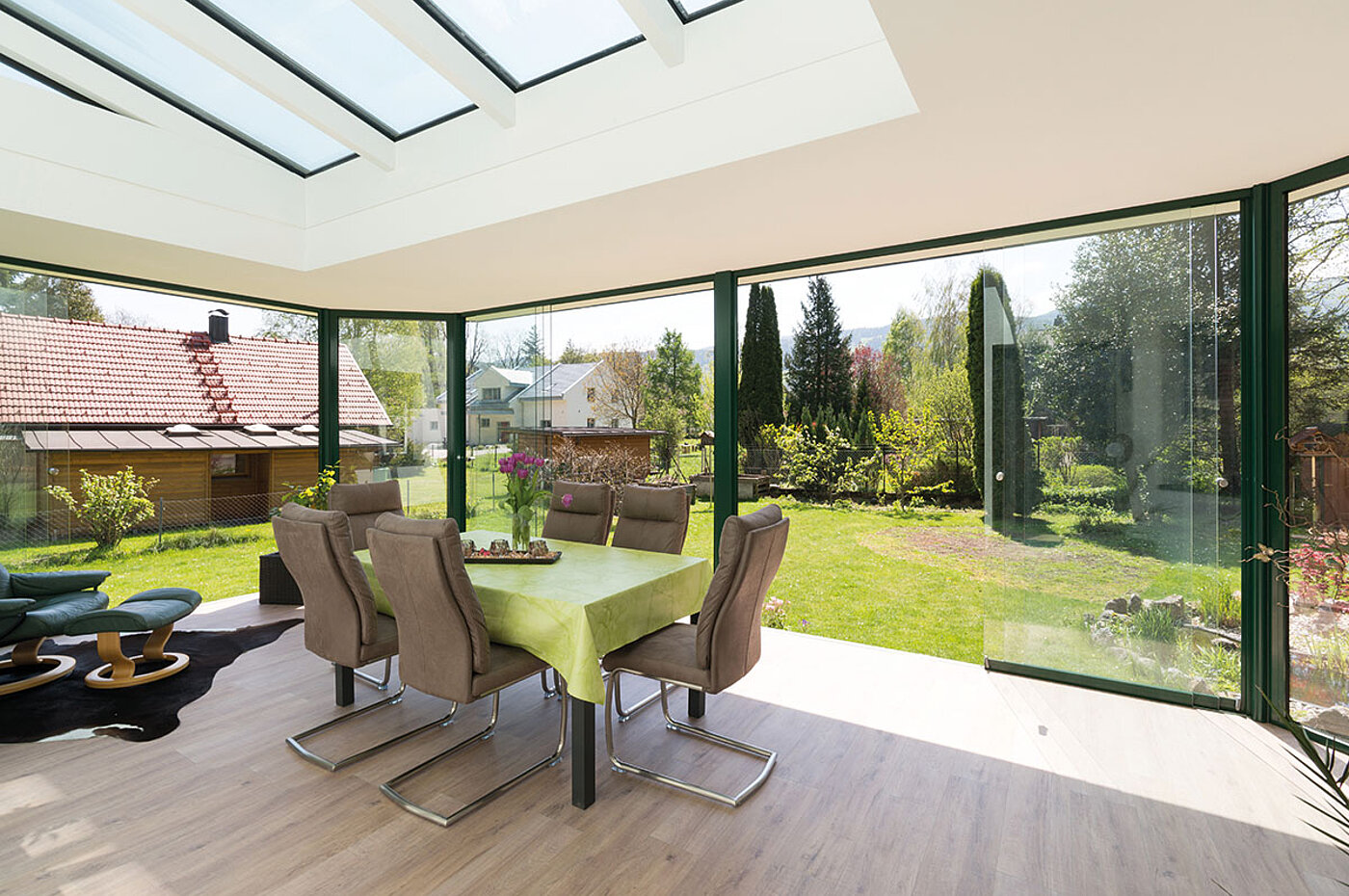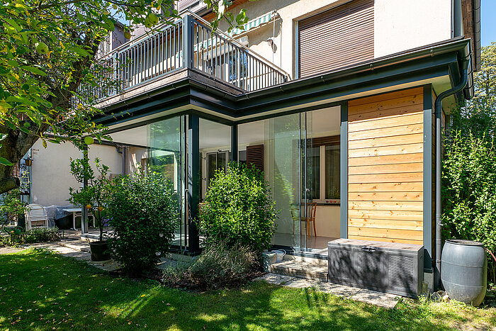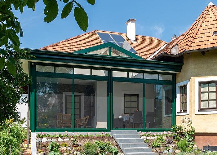 Massivdach mit optimalem Sonnenschutz und transparenter Sicht in den Garten.