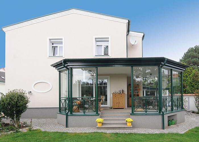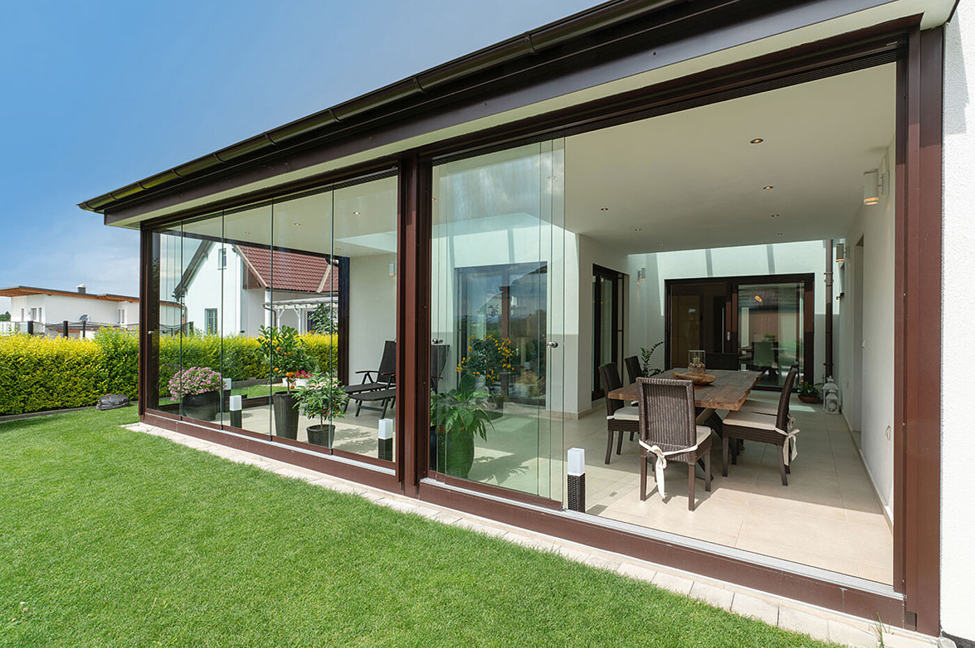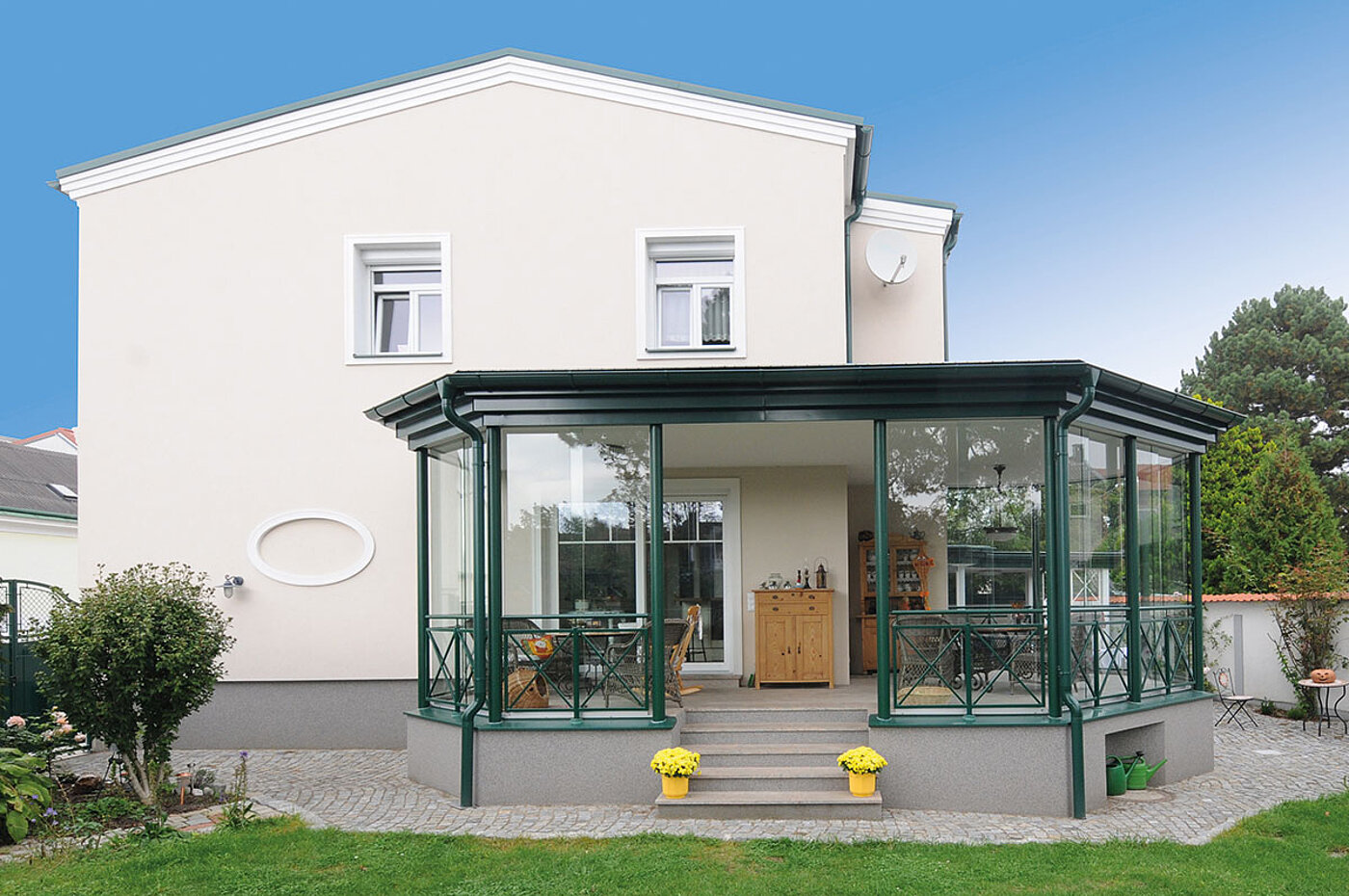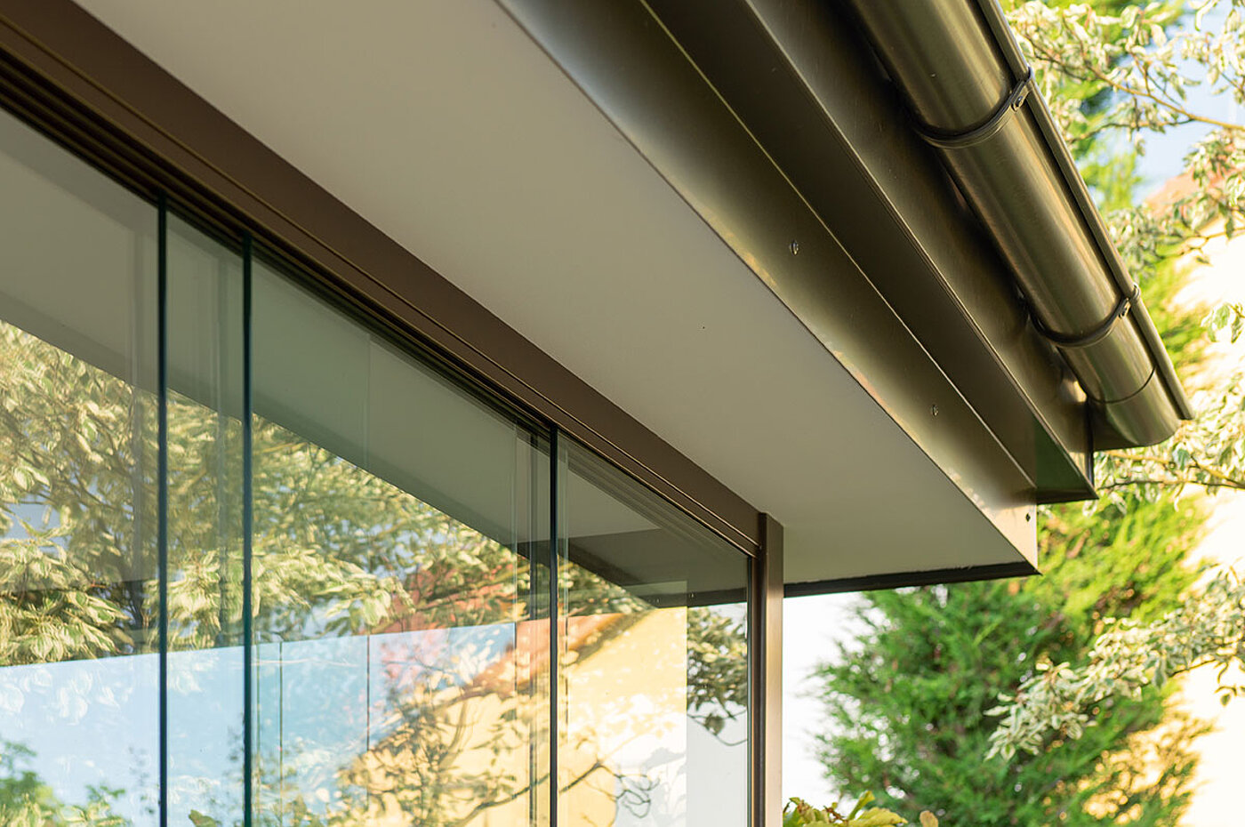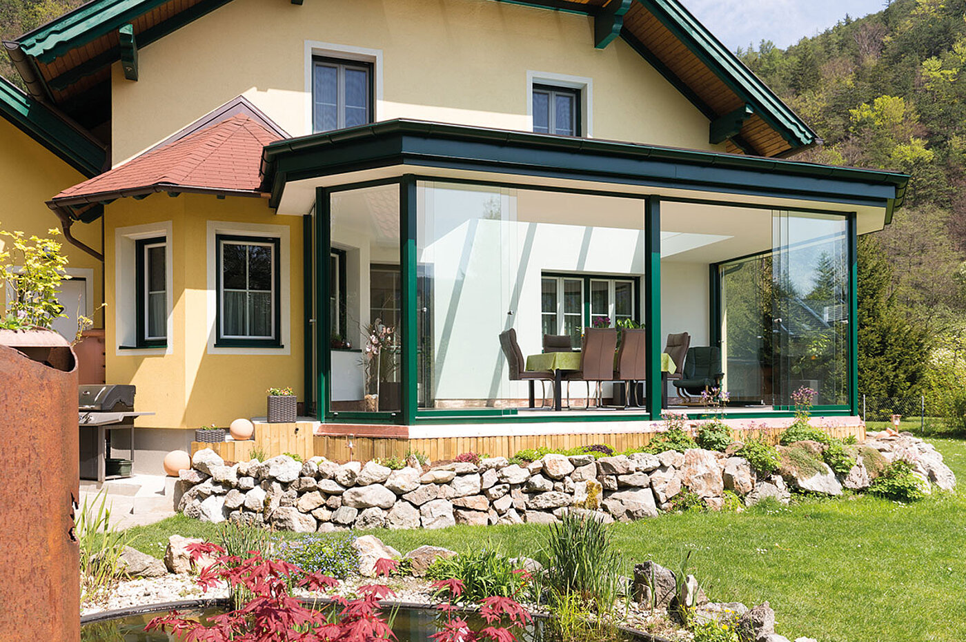 Massivdach mit optimalem Sonnenschutz und transparenter Sicht in den Garten.