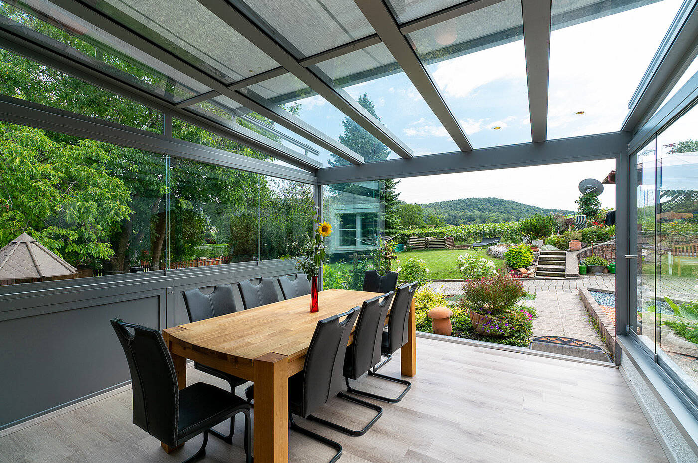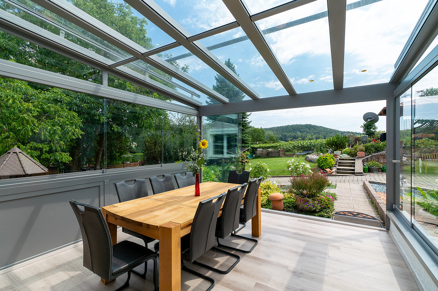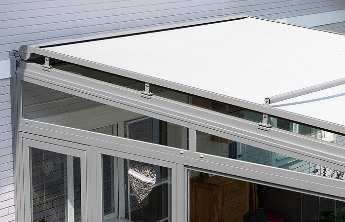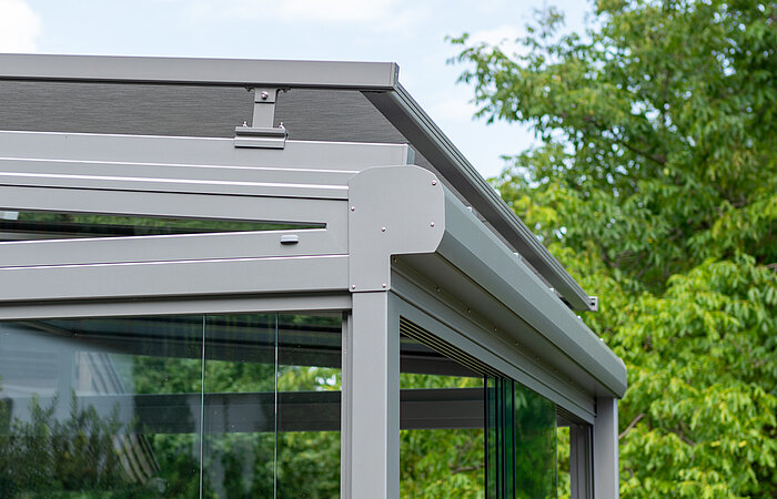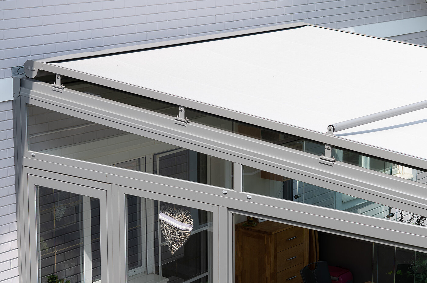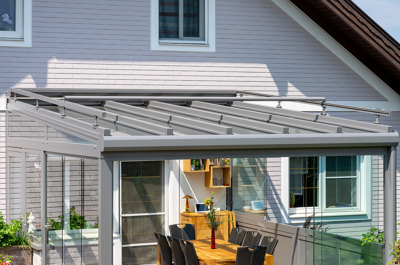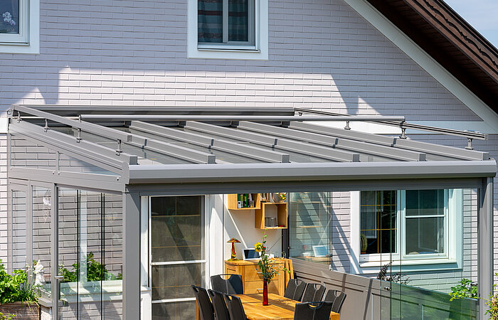 Die hochwertige Außenbeschattung auf dem Glasdach lässt die heiße Luft