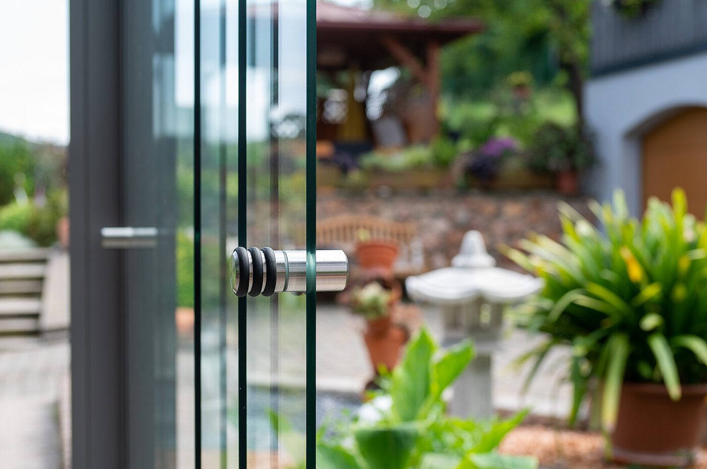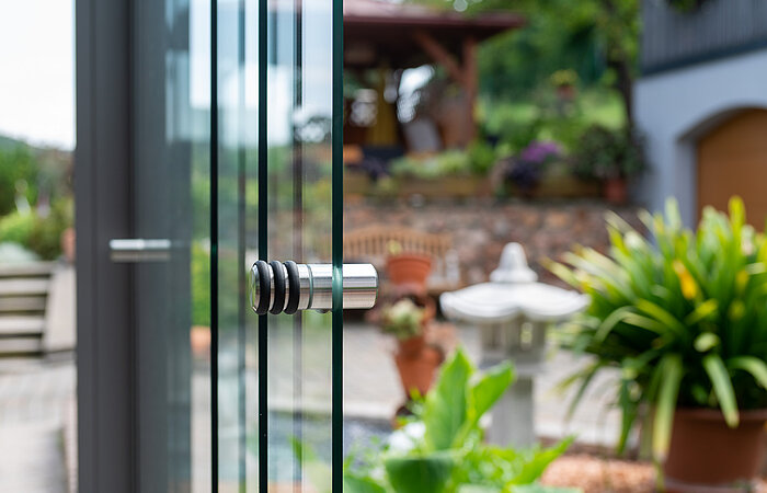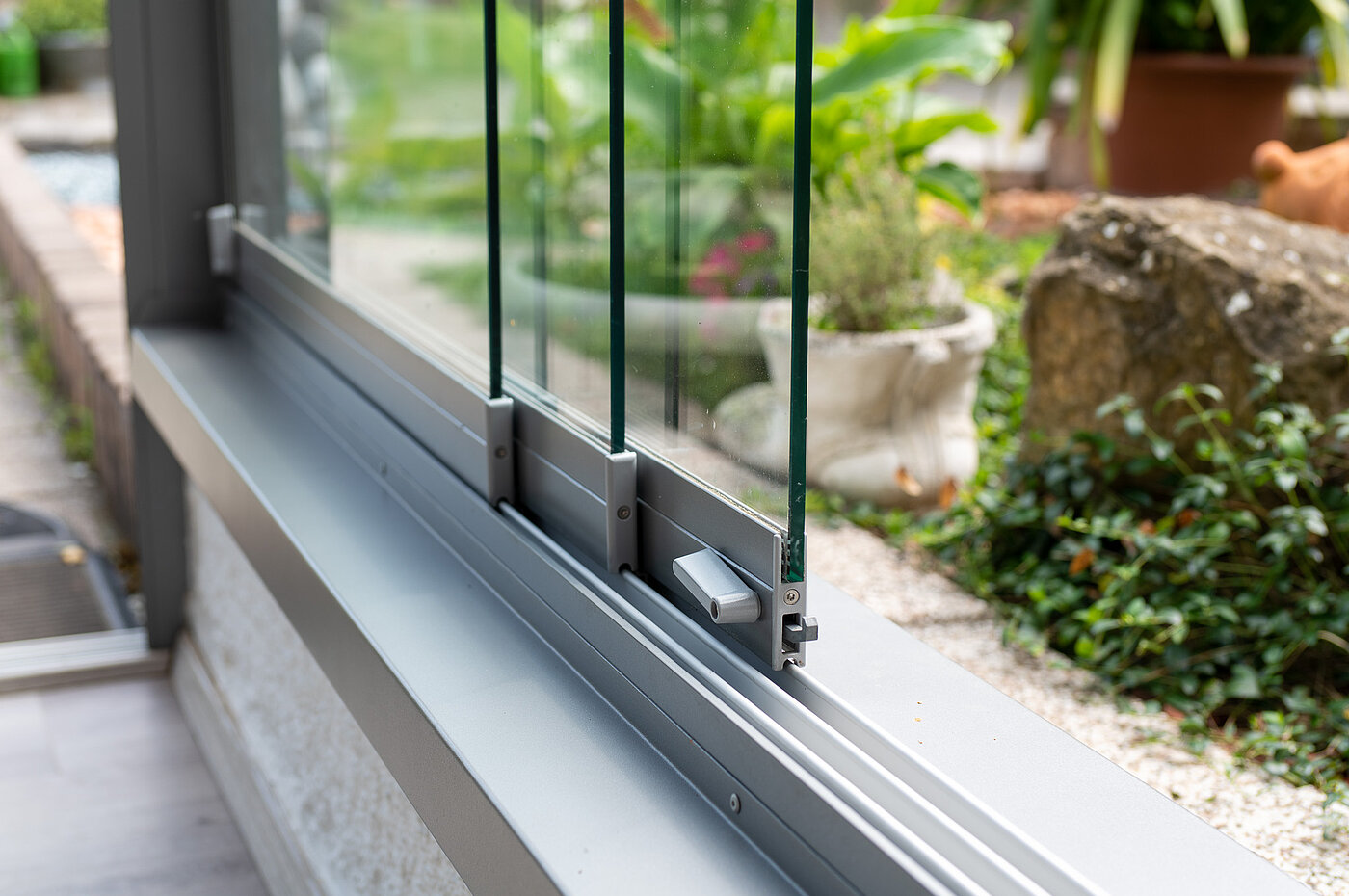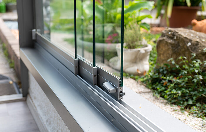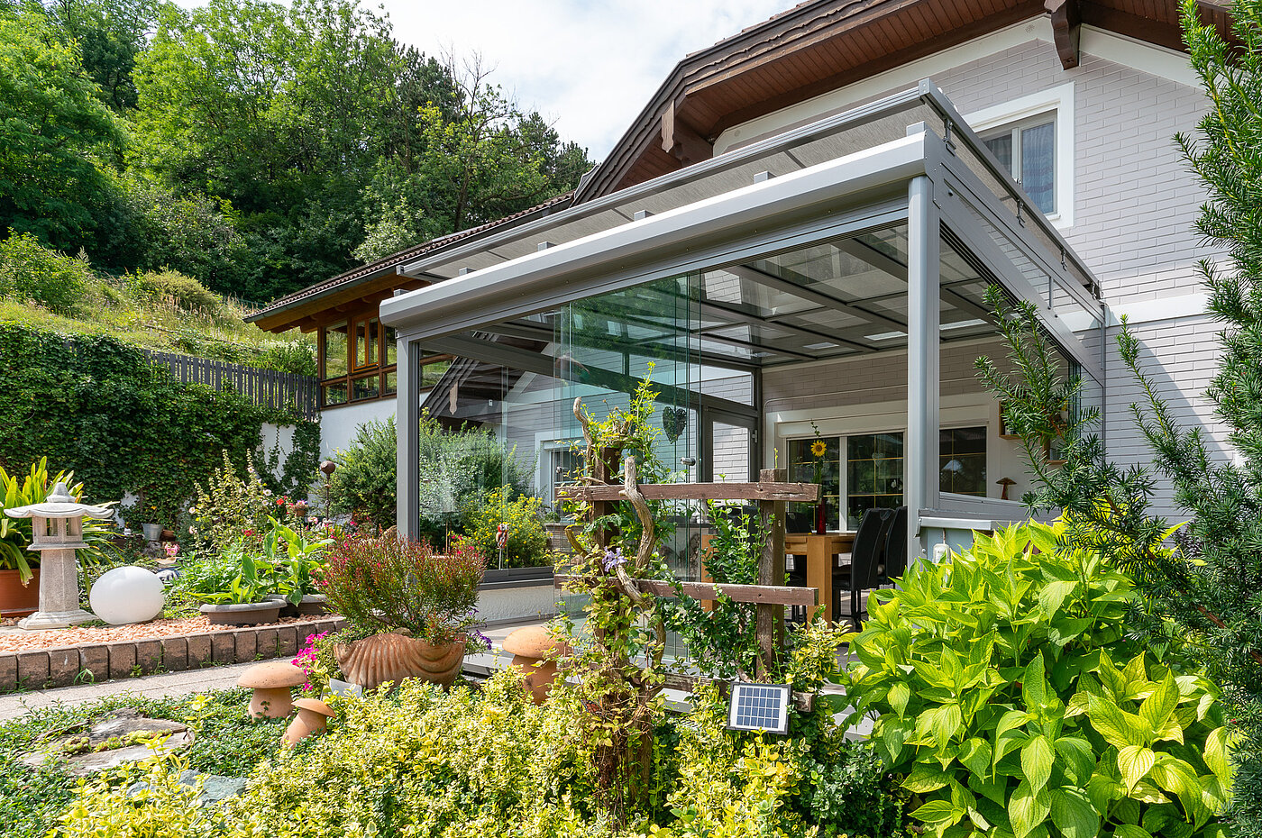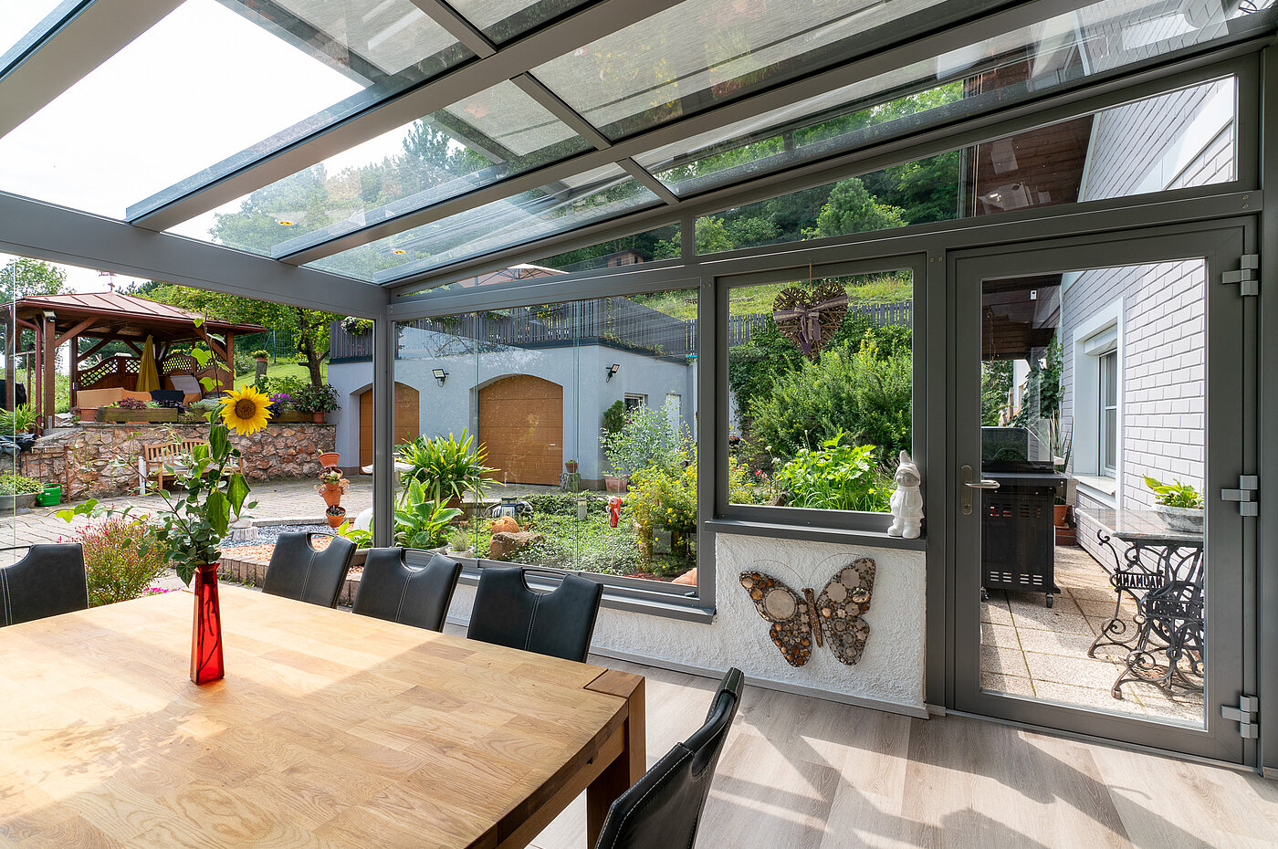 Die hochwertige Außenbeschattung auf dem Glasdach lässt die heiße Luft