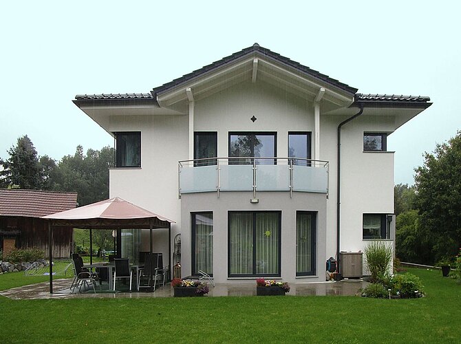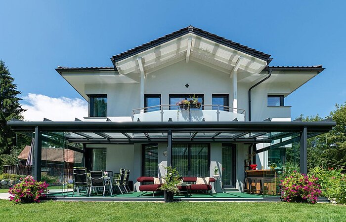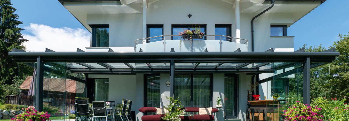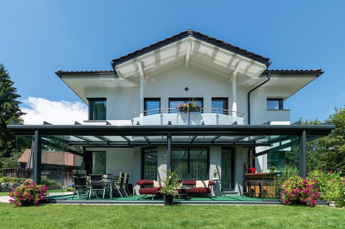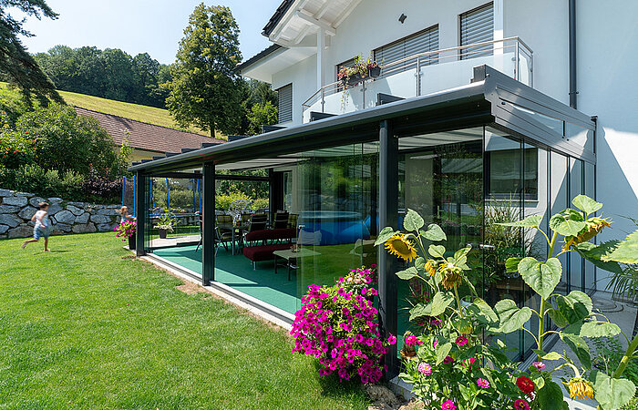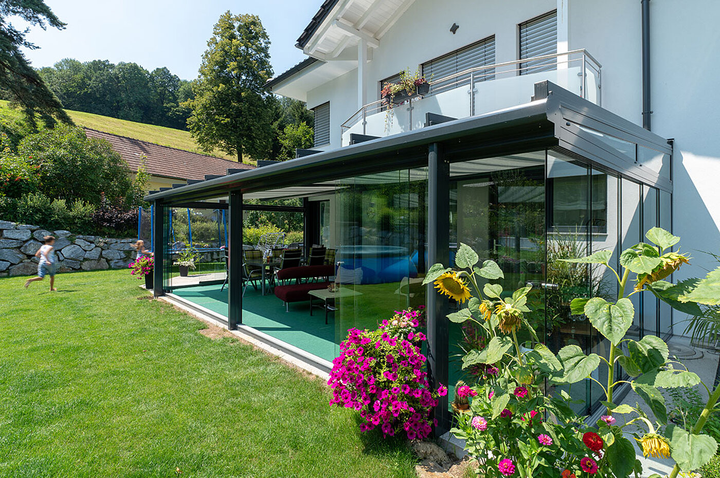 An ein modernen Haus mit bestehendem Erker wurde ein großzügig dimensionierter Sommergarten mit 9,3 x 4 Meter angebaut. Die eingerückten Säulen links und rechts ersparen eine zusätzliche Mittelsäule und ergeben transparente Ganzglasecken.