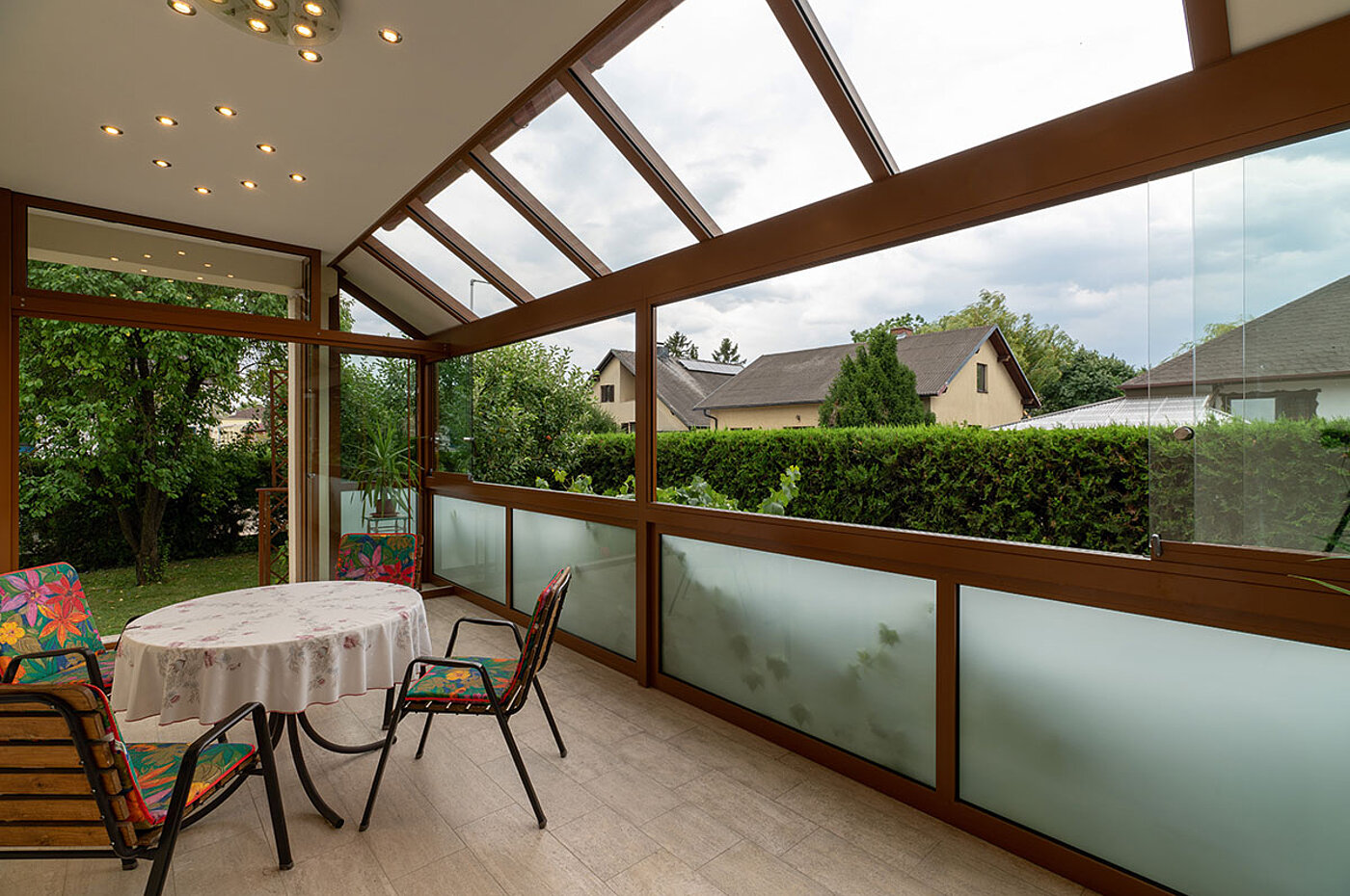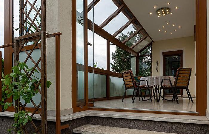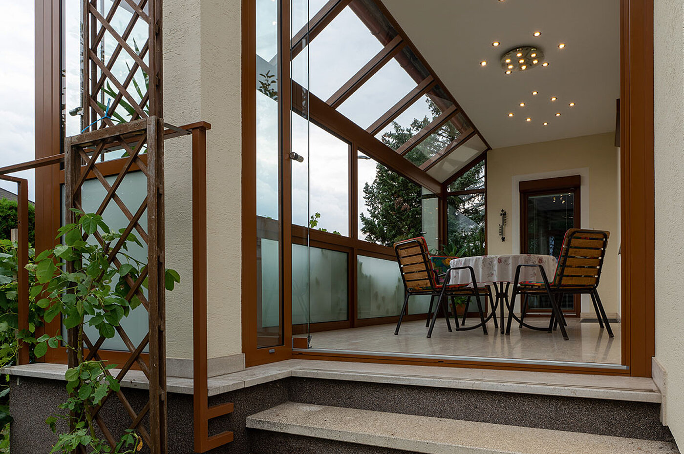 Bei diesem Sommergarten ersetzt eine Glasbrüstung mit Mattglas ein bestehendes Geländer.