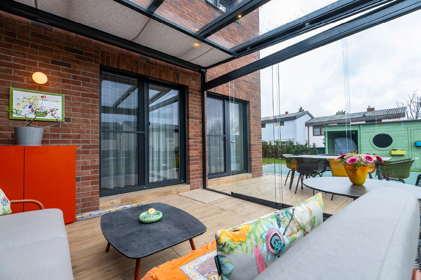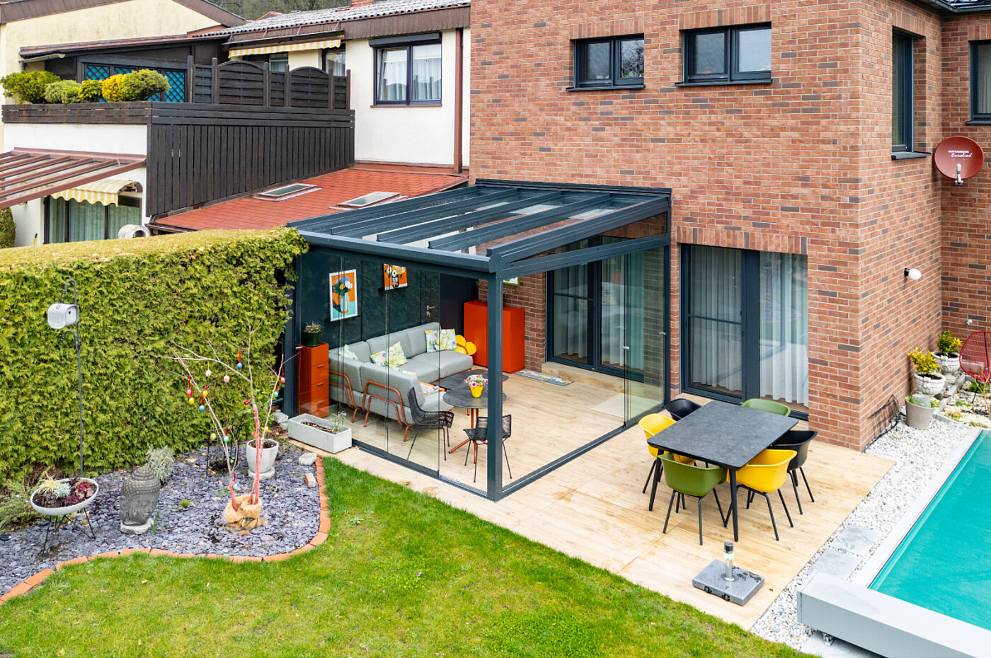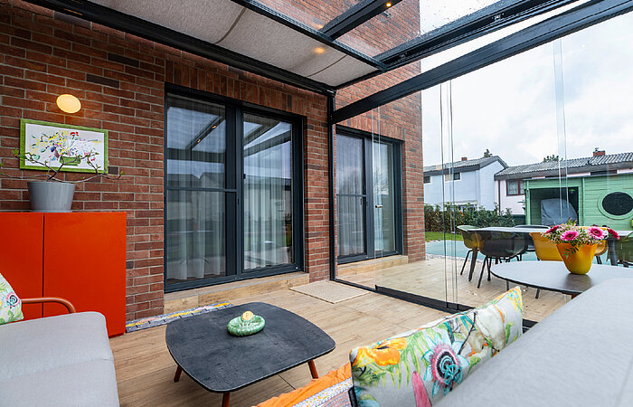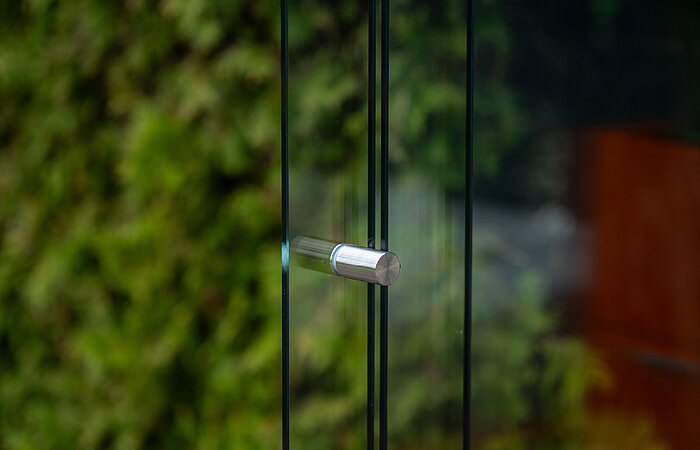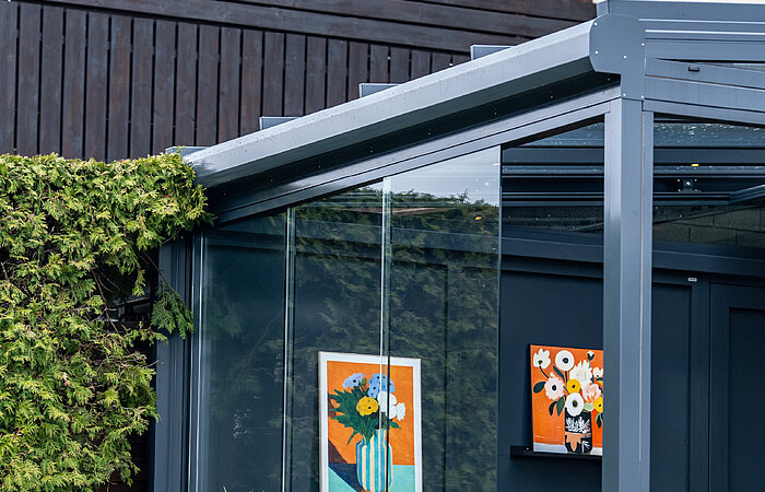 Eine fixe Aluwand mit Türe bietet Sichtschutz und Durchgang gleichzeitig.