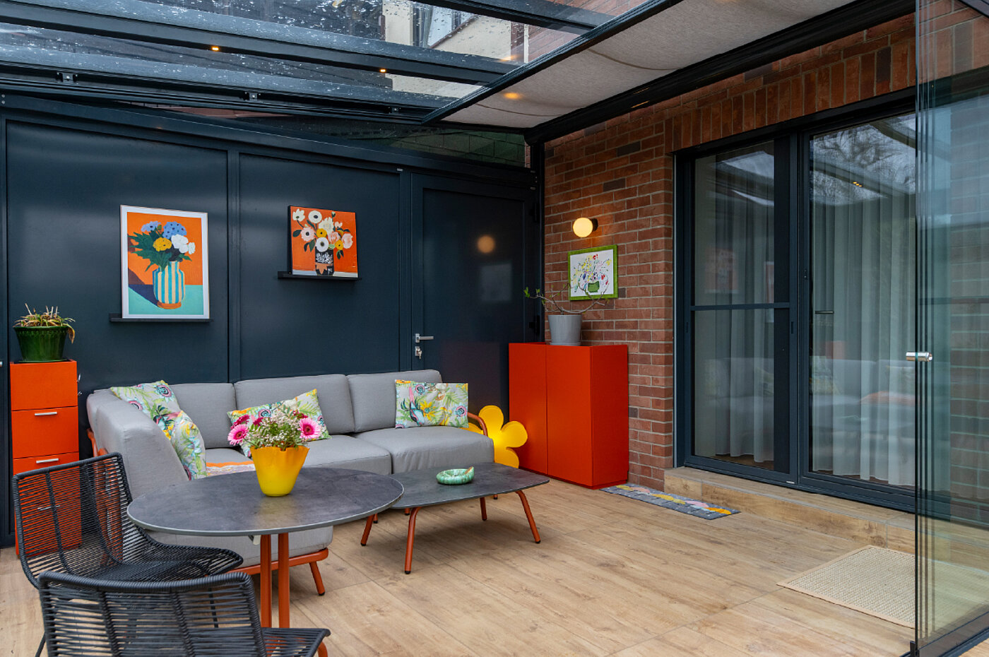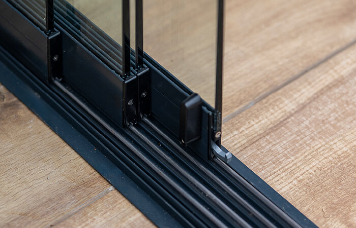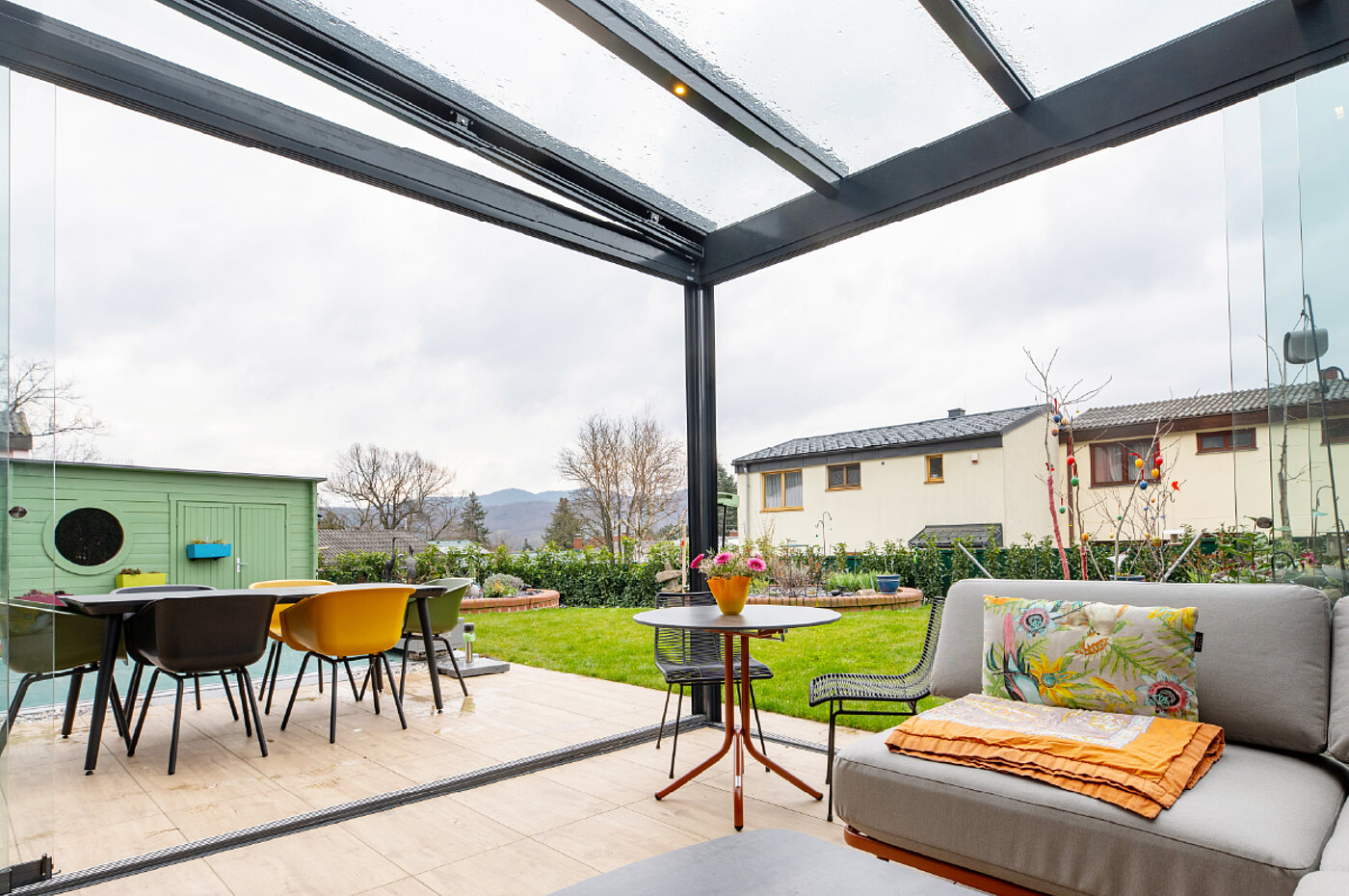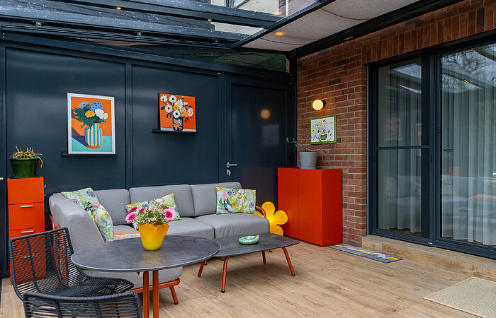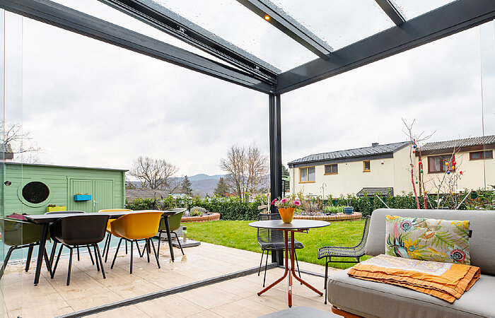 Eine fixe Aluwand mit Türe bietet Sichtschutz und Durchgang gleichzeitig.