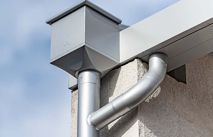 Die bereits vorhandene Regenrinne des Hauses läuft mit der Regenrinne der Glasüberdachung zusammen und leitet das Wasser gesammelt zu Boden.