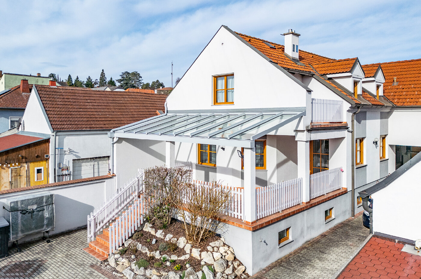 Die Überdachung deckt die gesamte Breite des Hauses inklusive Kellerabgang ab.