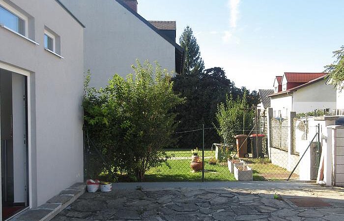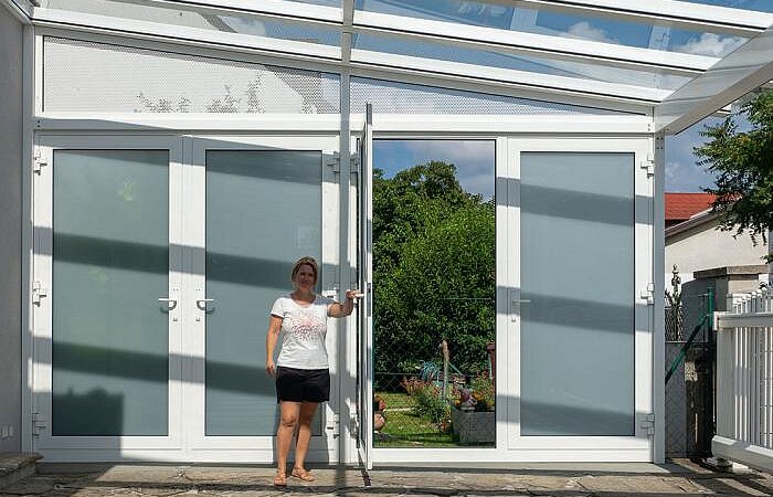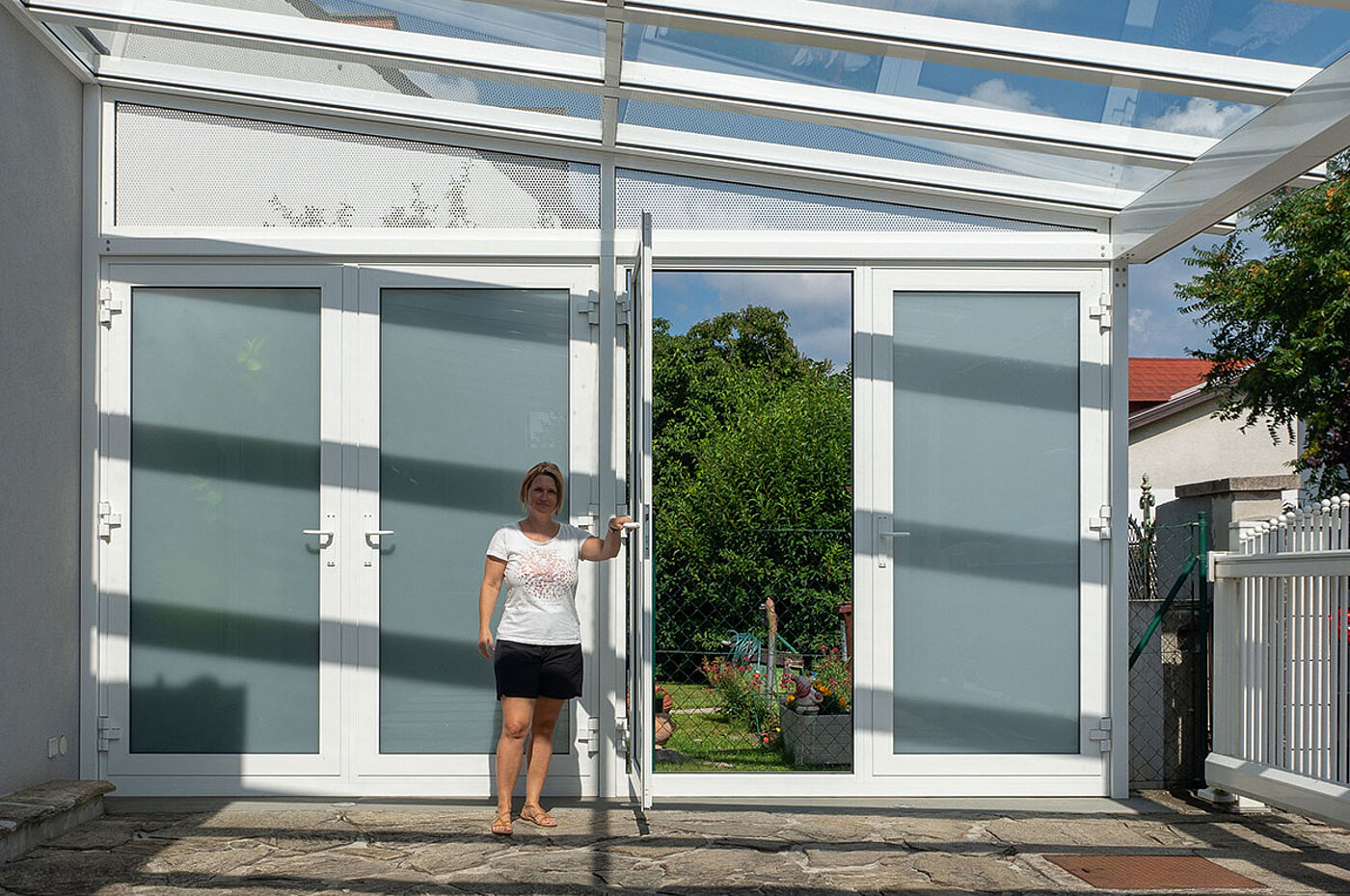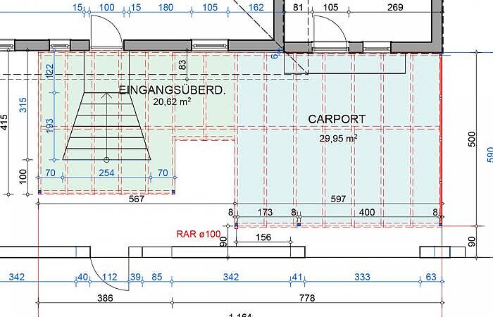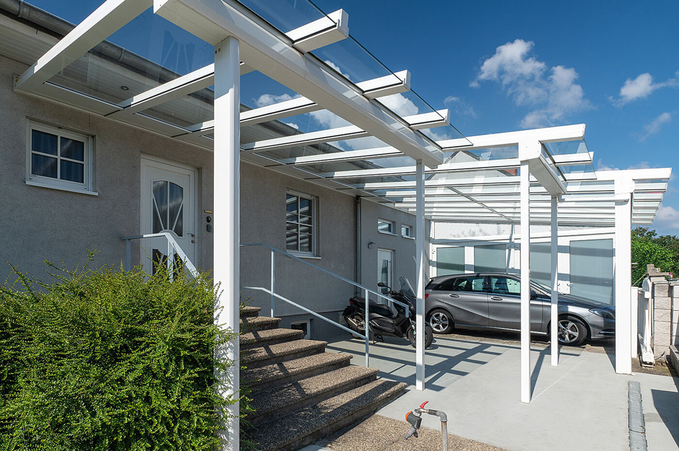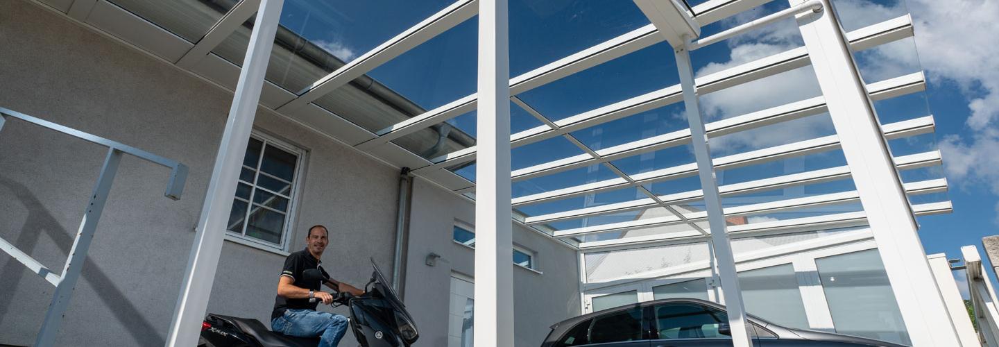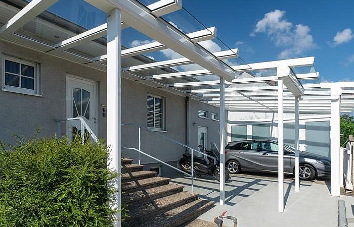 Carport und Hauseingangsüberdachung mit einer Grundfläche von 11,6 x 5,9 Metern – auch der Roller hat einen geschützten Platz gefunden.
