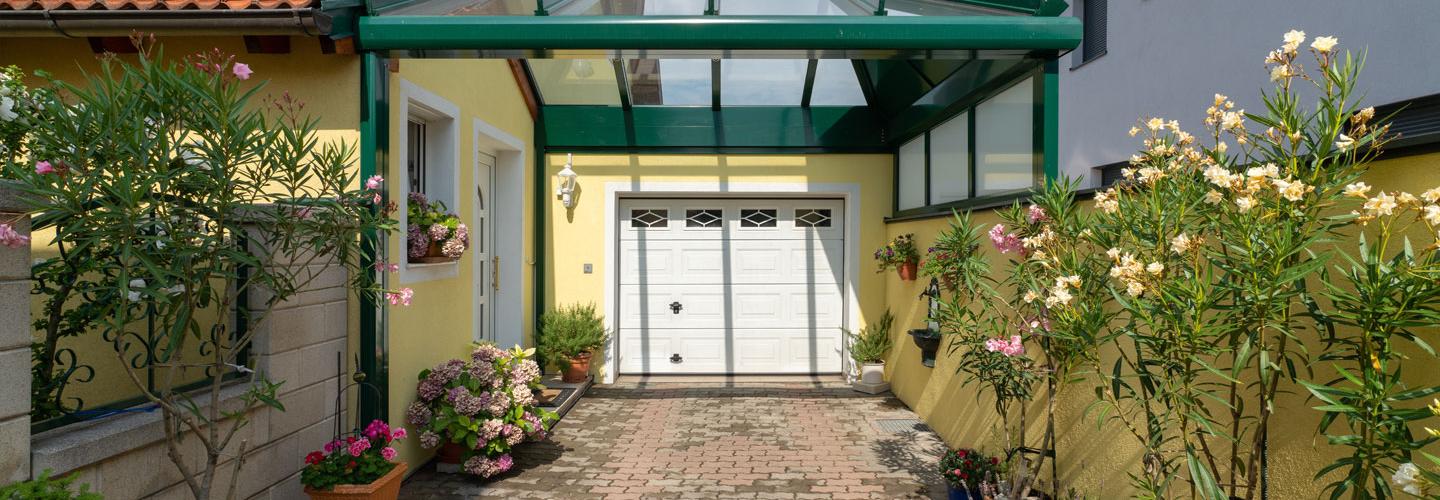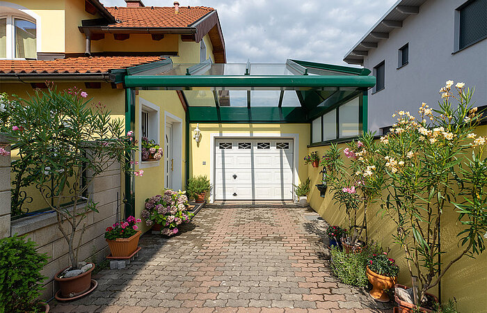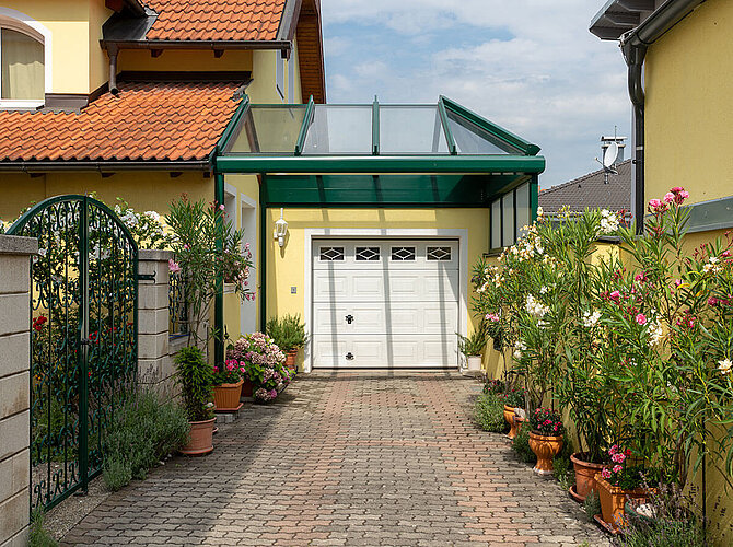 Zwischen Haus und bestehender Garage wurde ein Aluglasdach eingepasst, das gleichzeitig den Eingangsbereich schützt und als Carport dient. Das neue Glasdach greift die Neigung des Satteldaches im Eingangsbereich auf und wird zum Nachbarn hin mit einem Walm abgeschrägt.