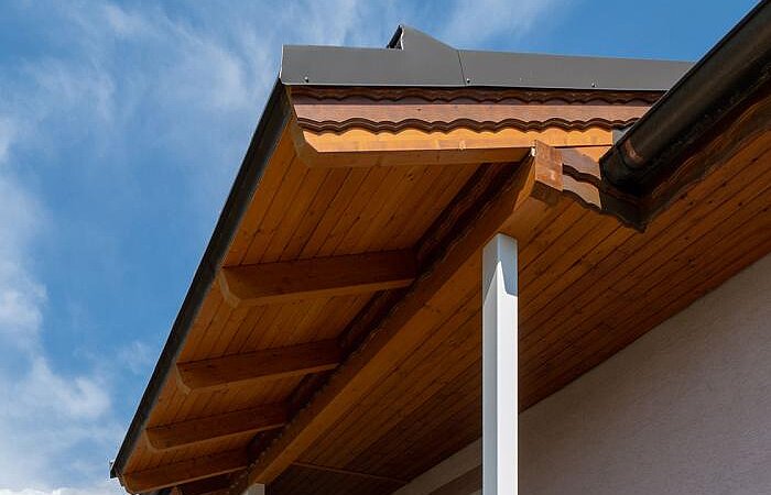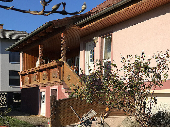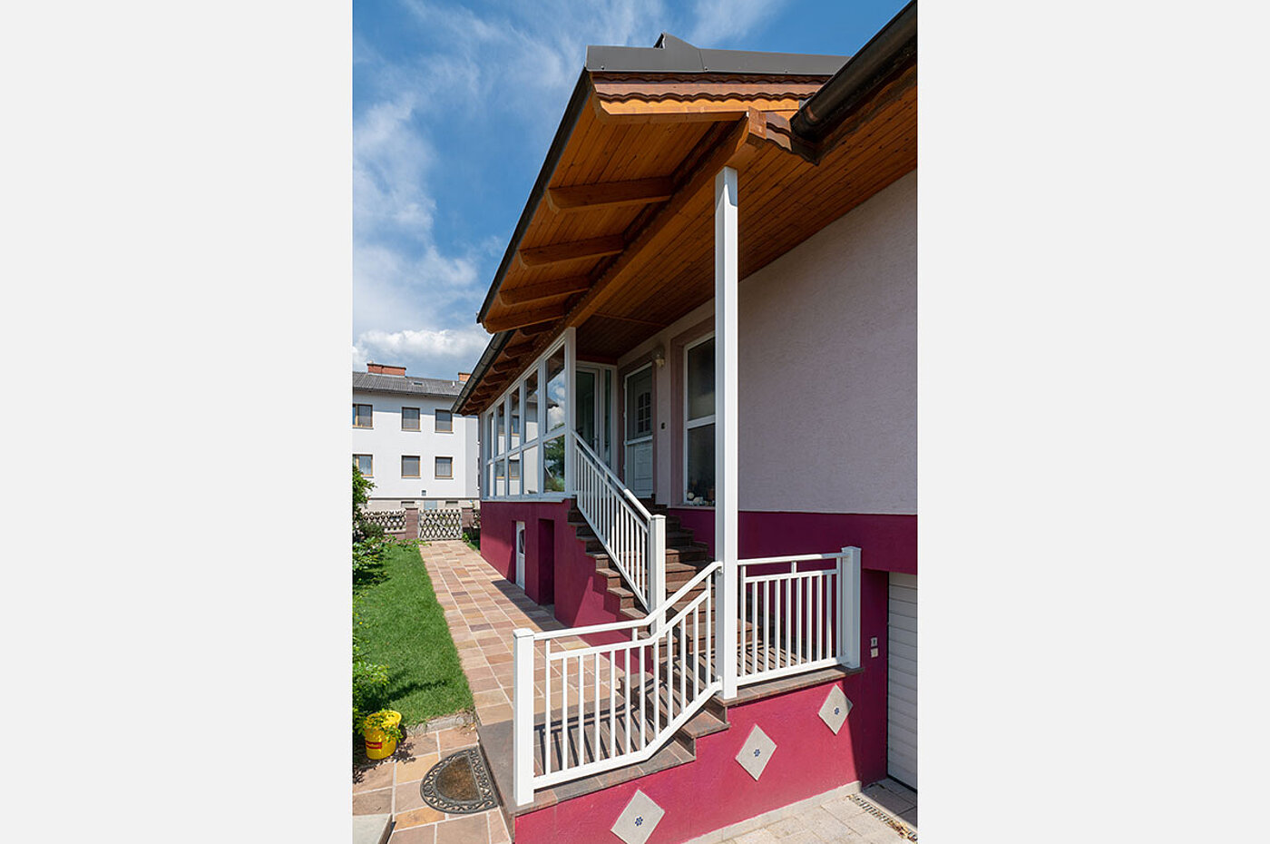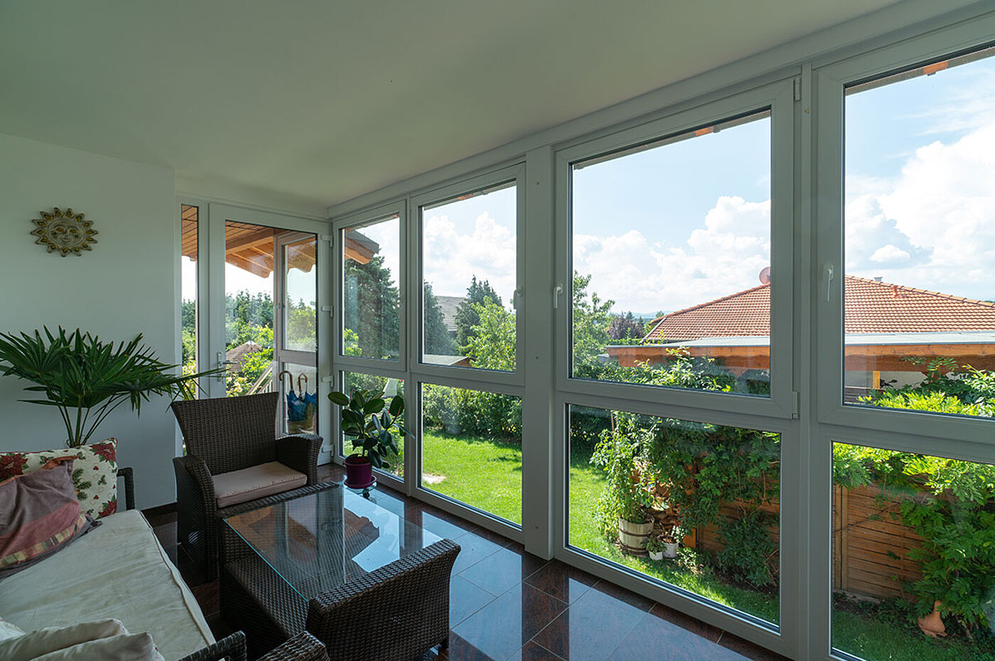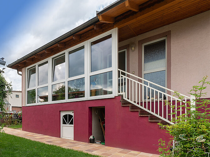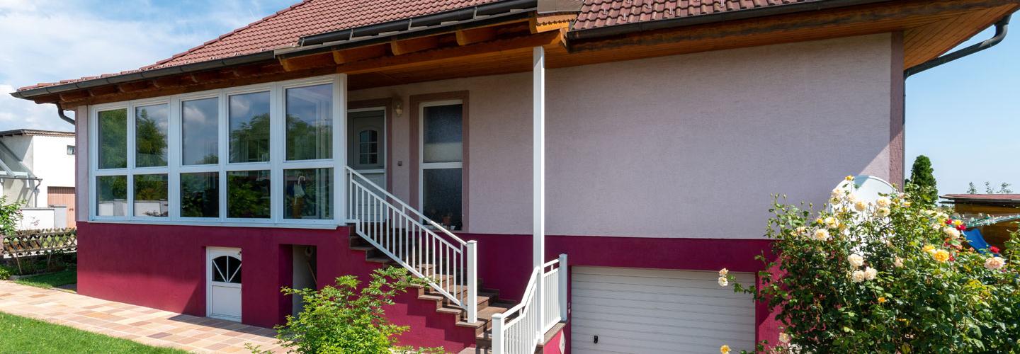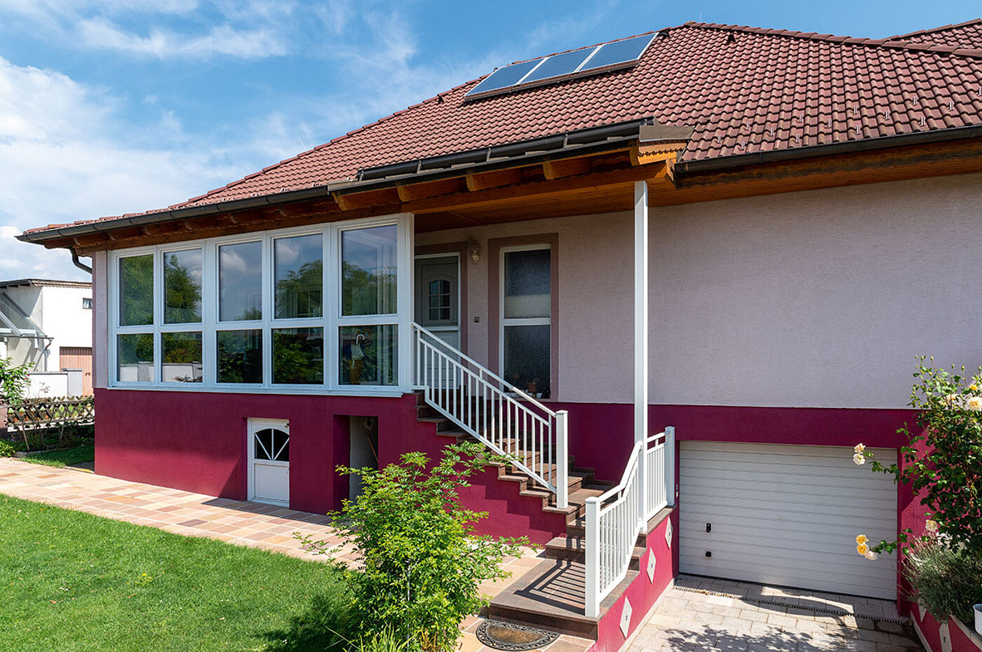 An einem Bungalow wurde in eine bestehende Terrasse mit Pultdach ein Kunststoff-Wintergarten eingepasst.
