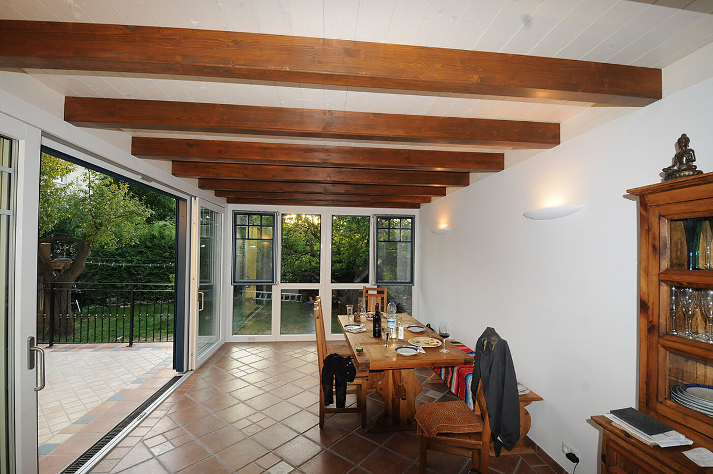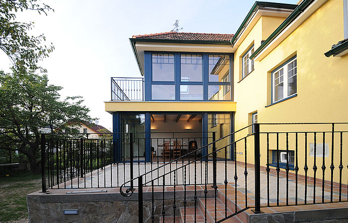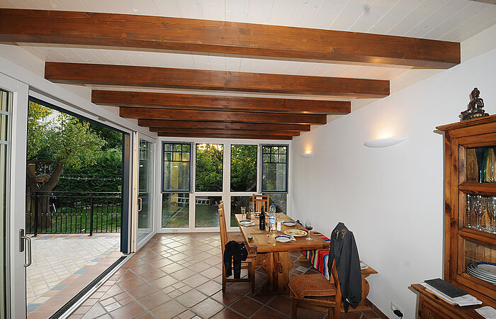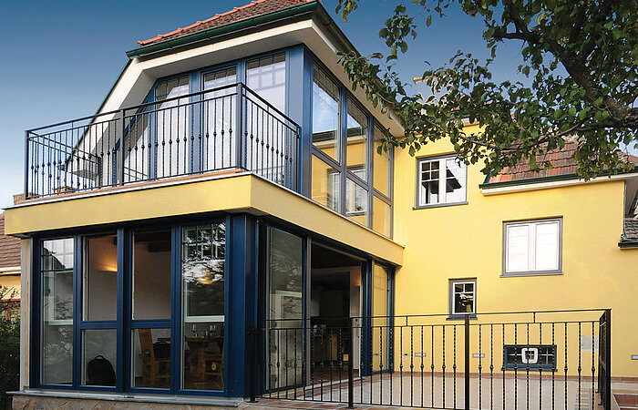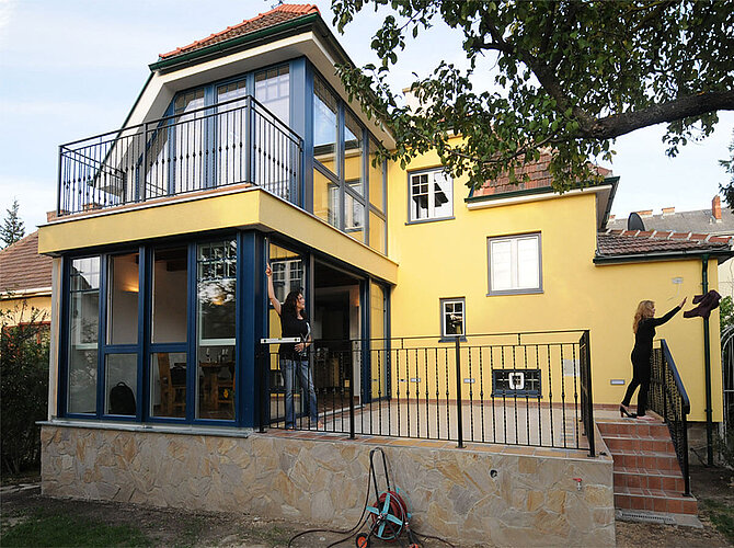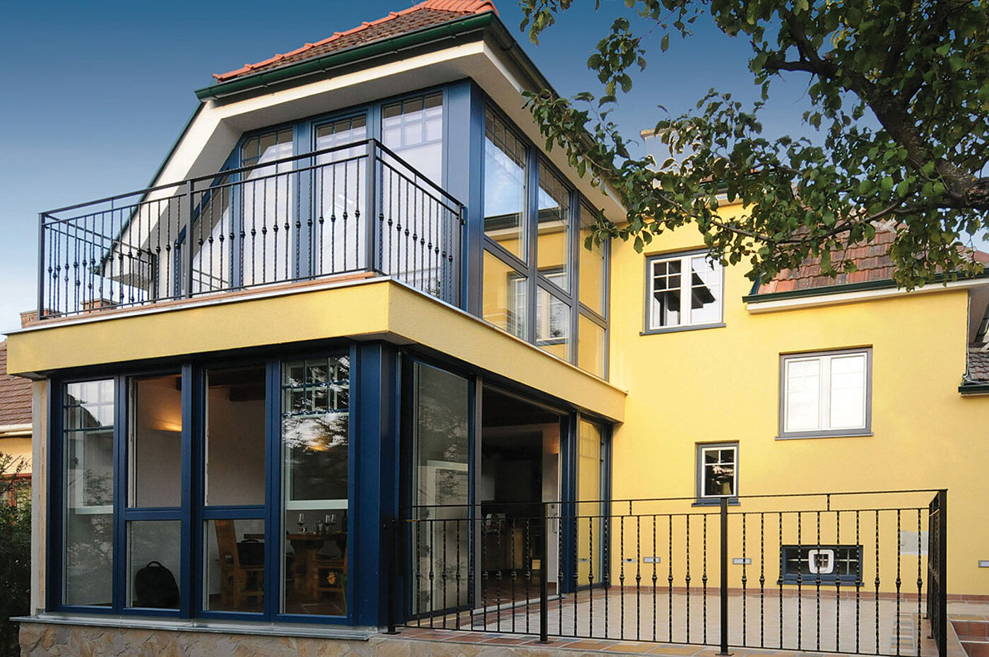 An diesem Haus sorgt ein großzügiger, zweigeschossiger Wintergarten für eine beträchtliche Steigerung der Wohnqualität.