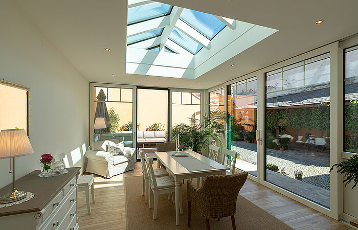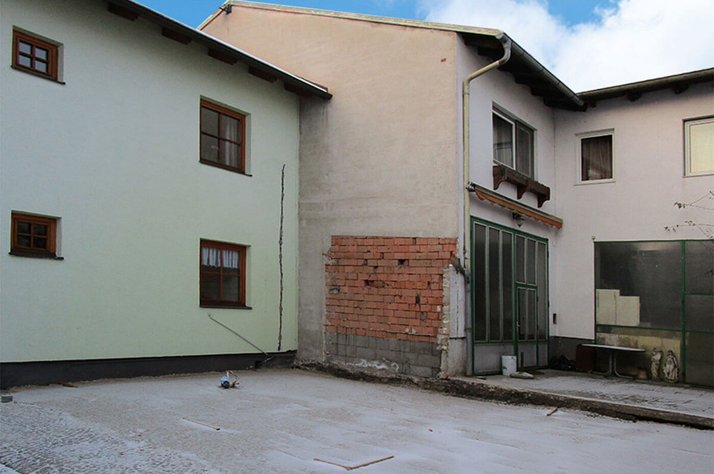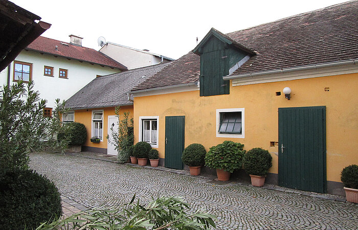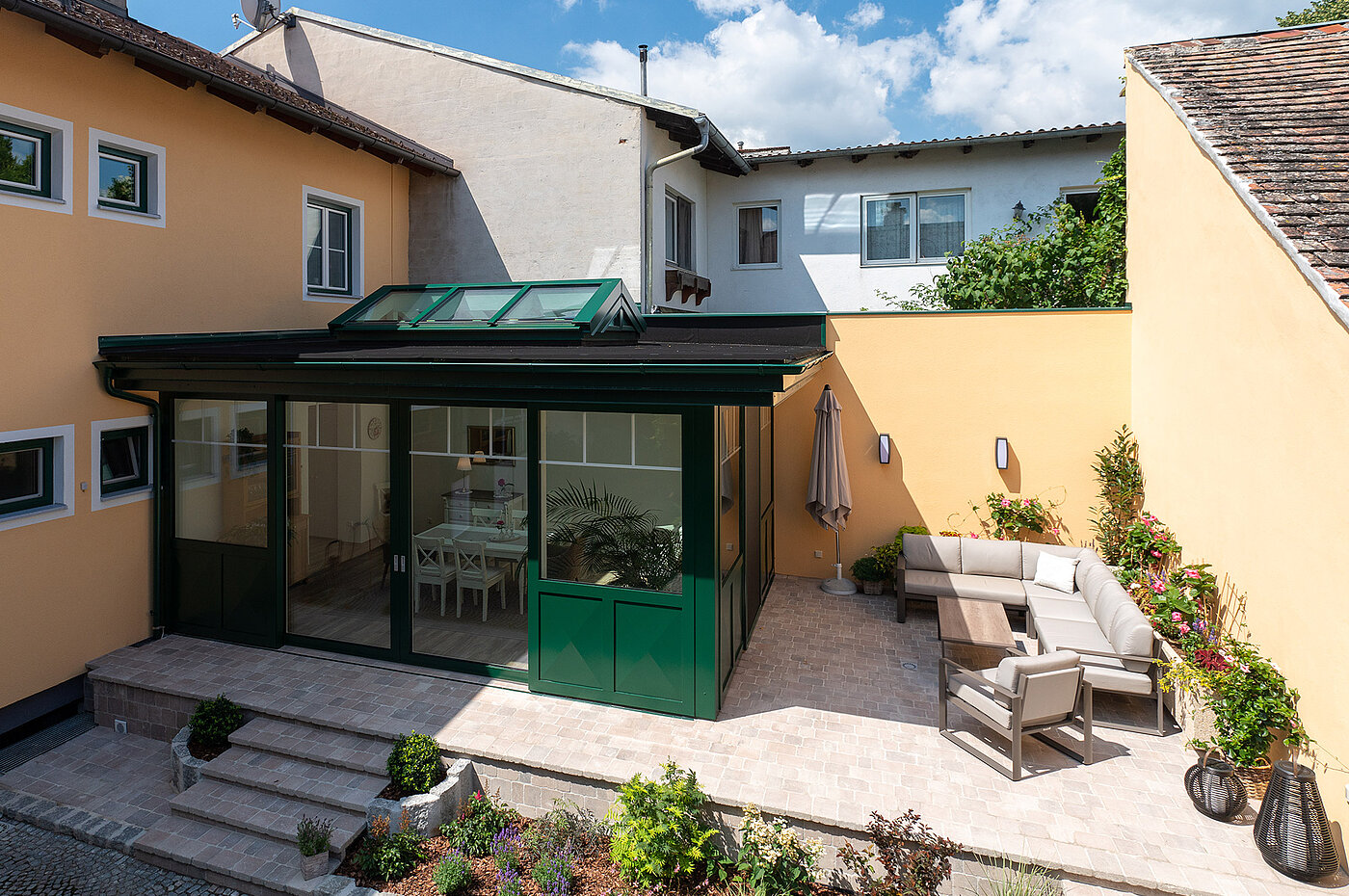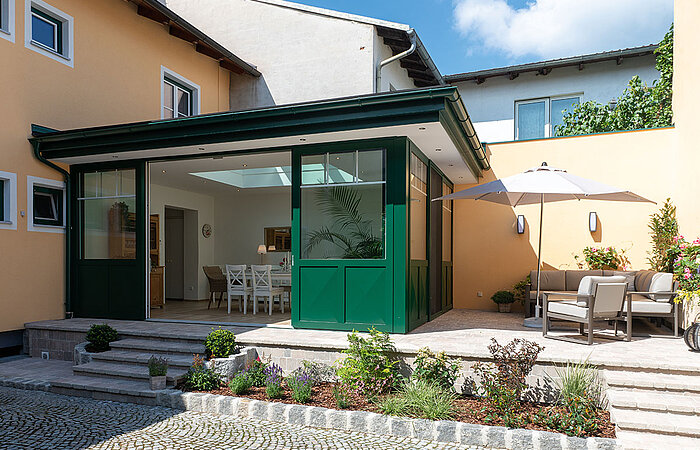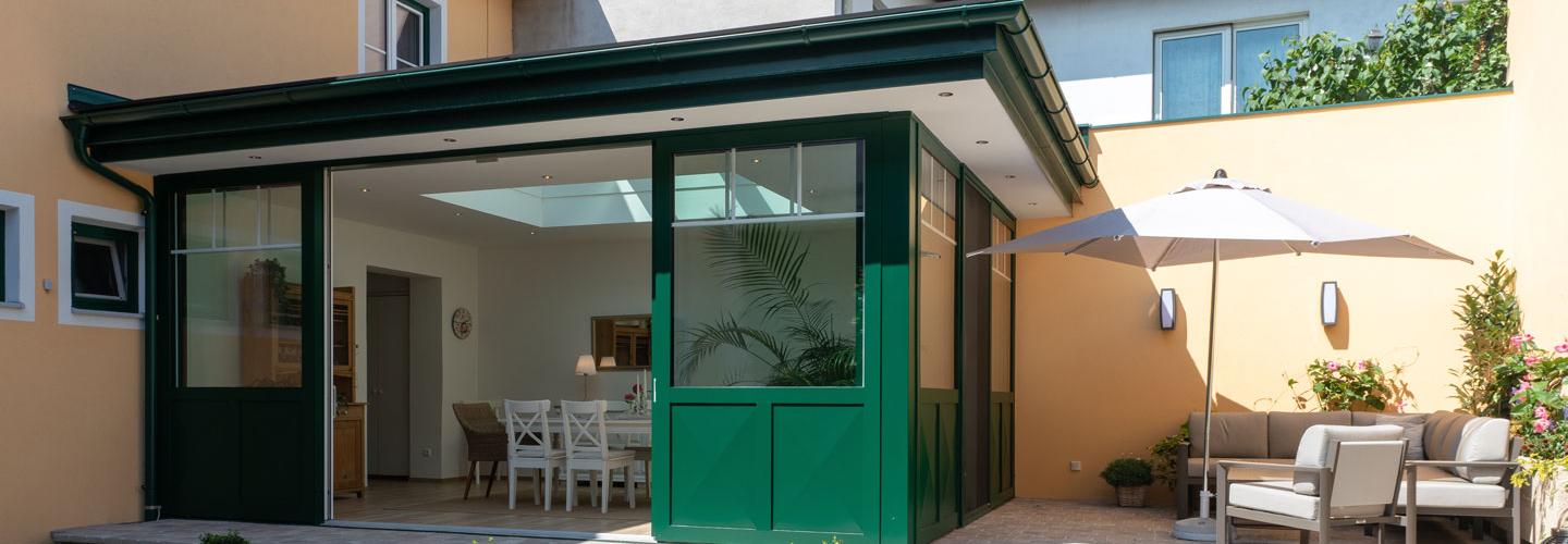 Ein altes, erwürdiges Winzerhaus wurde im Bezirk Baden abgerissen und durch einen modernen Holzalu-Wintergarten ersetzt. Dieser verbindet das bestehende Haus mit dem gemütlichen Innenhof.