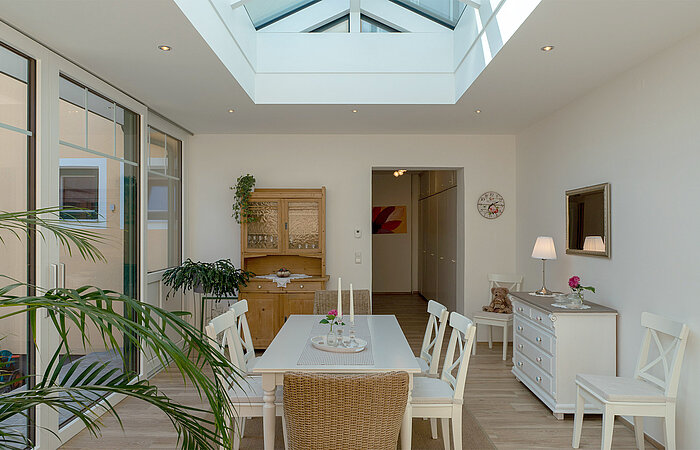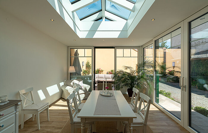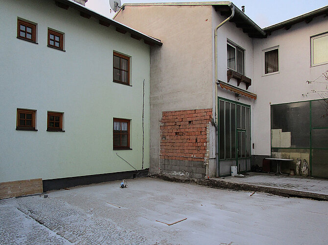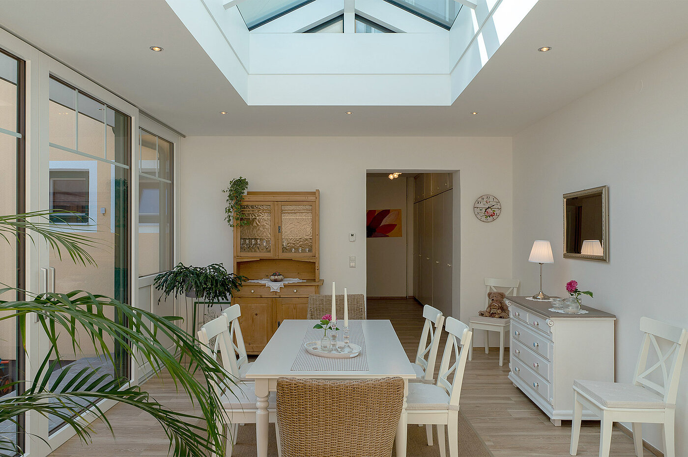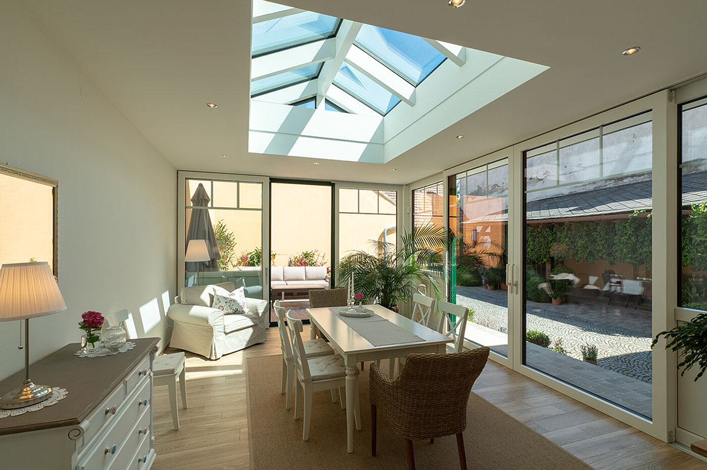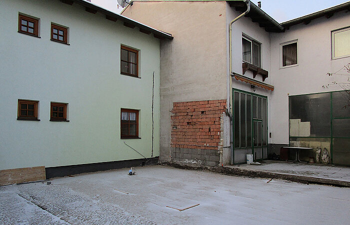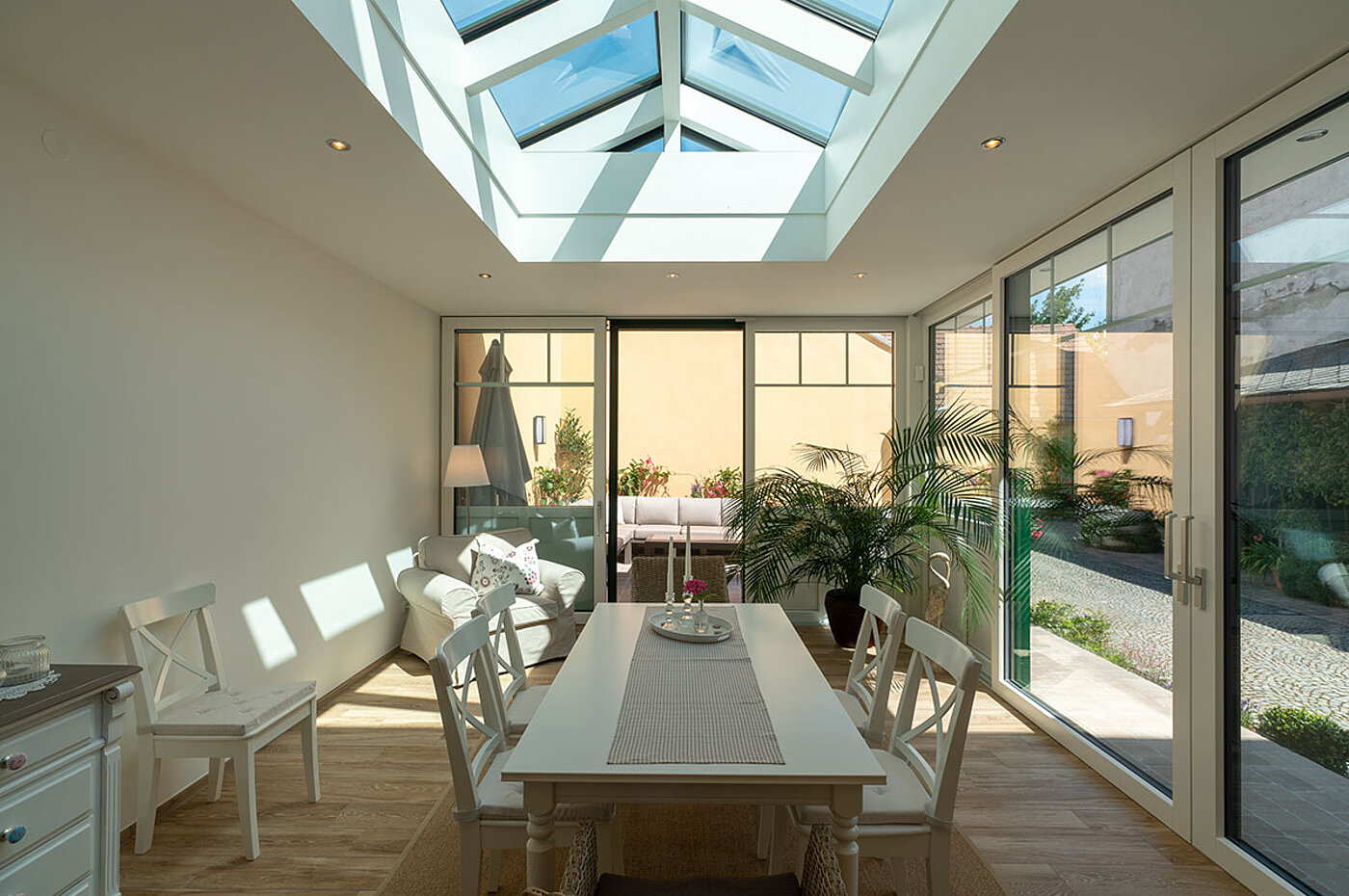 Ein altes, erwürdiges Winzerhaus wurde im Bezirk Baden abgerissen und durch einen modernen Holzalu-Wintergarten ersetzt. Dieser verbindet das bestehende Haus mit dem gemütlichen Innenhof.