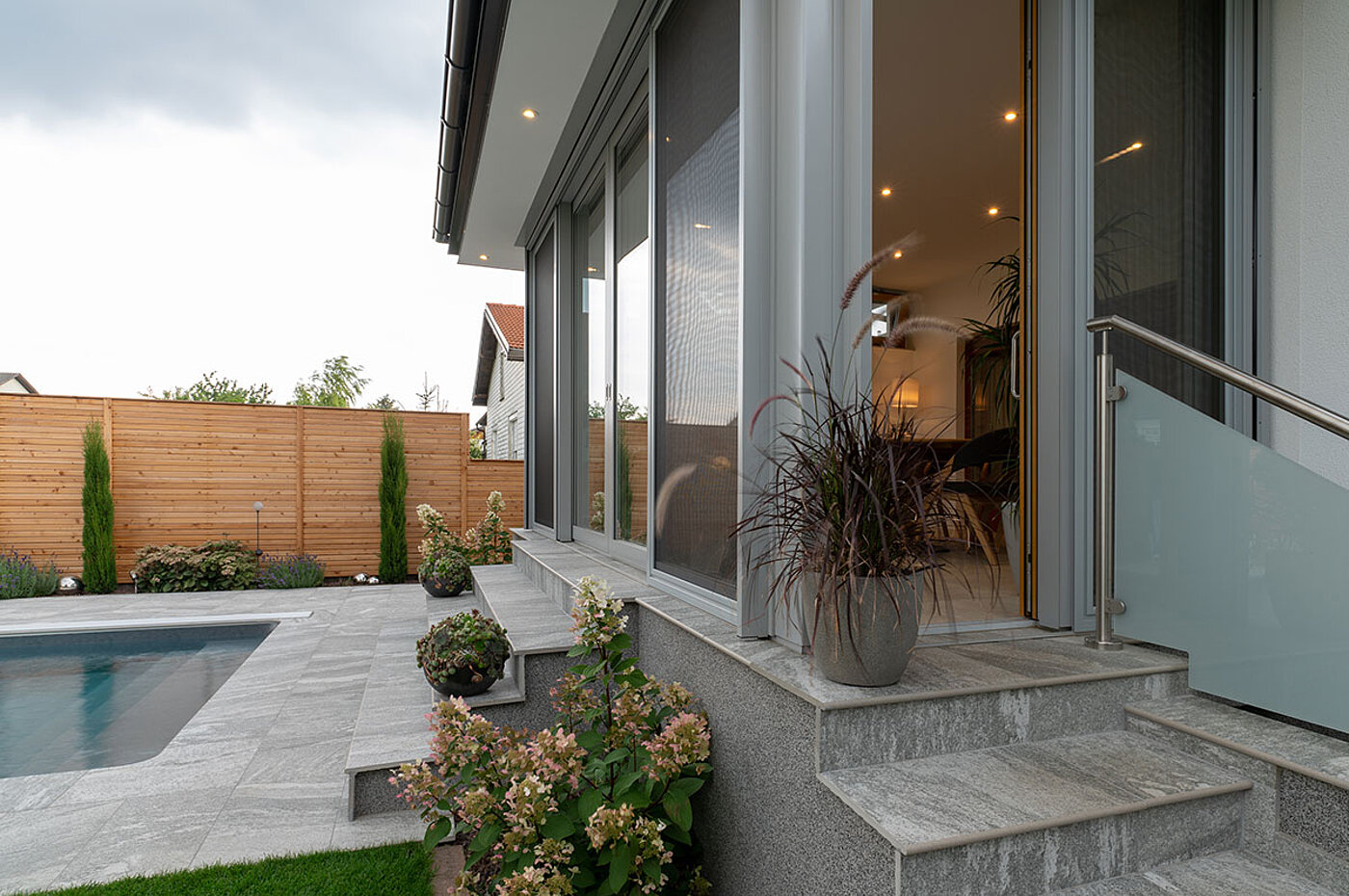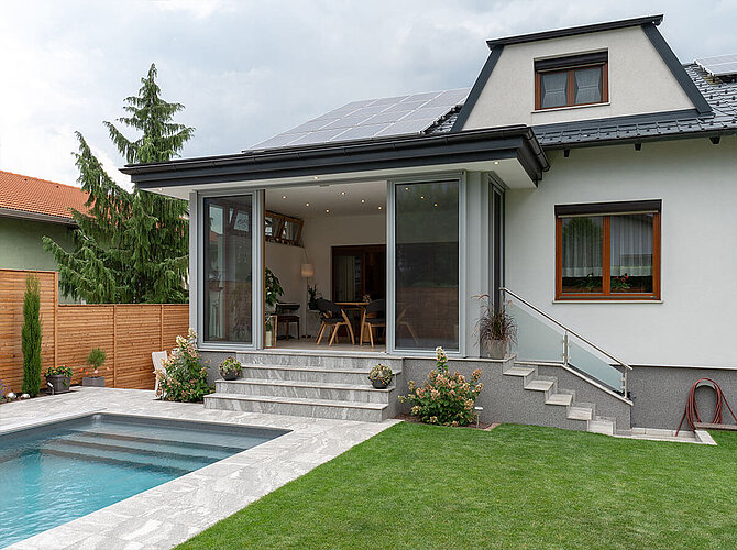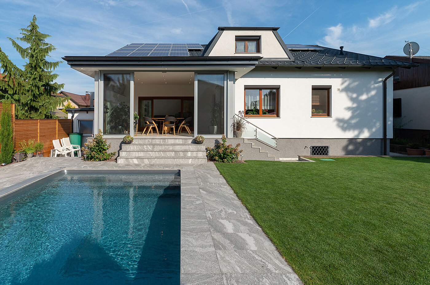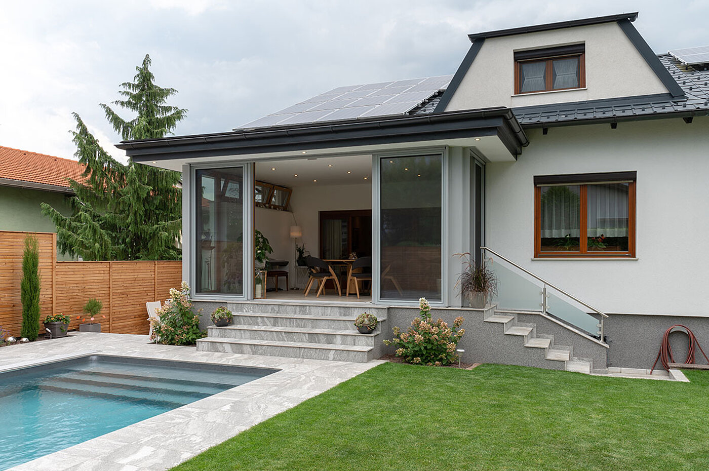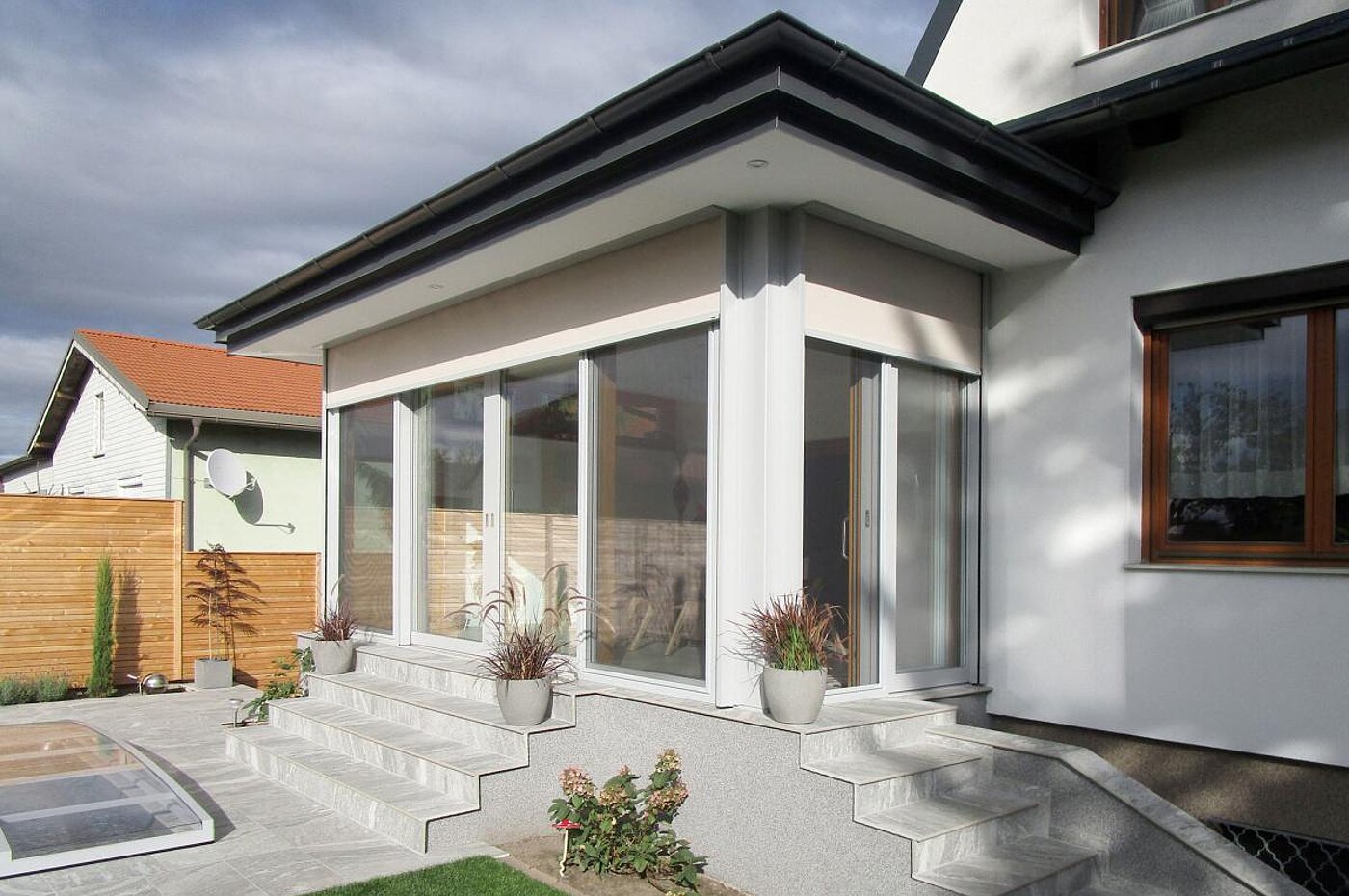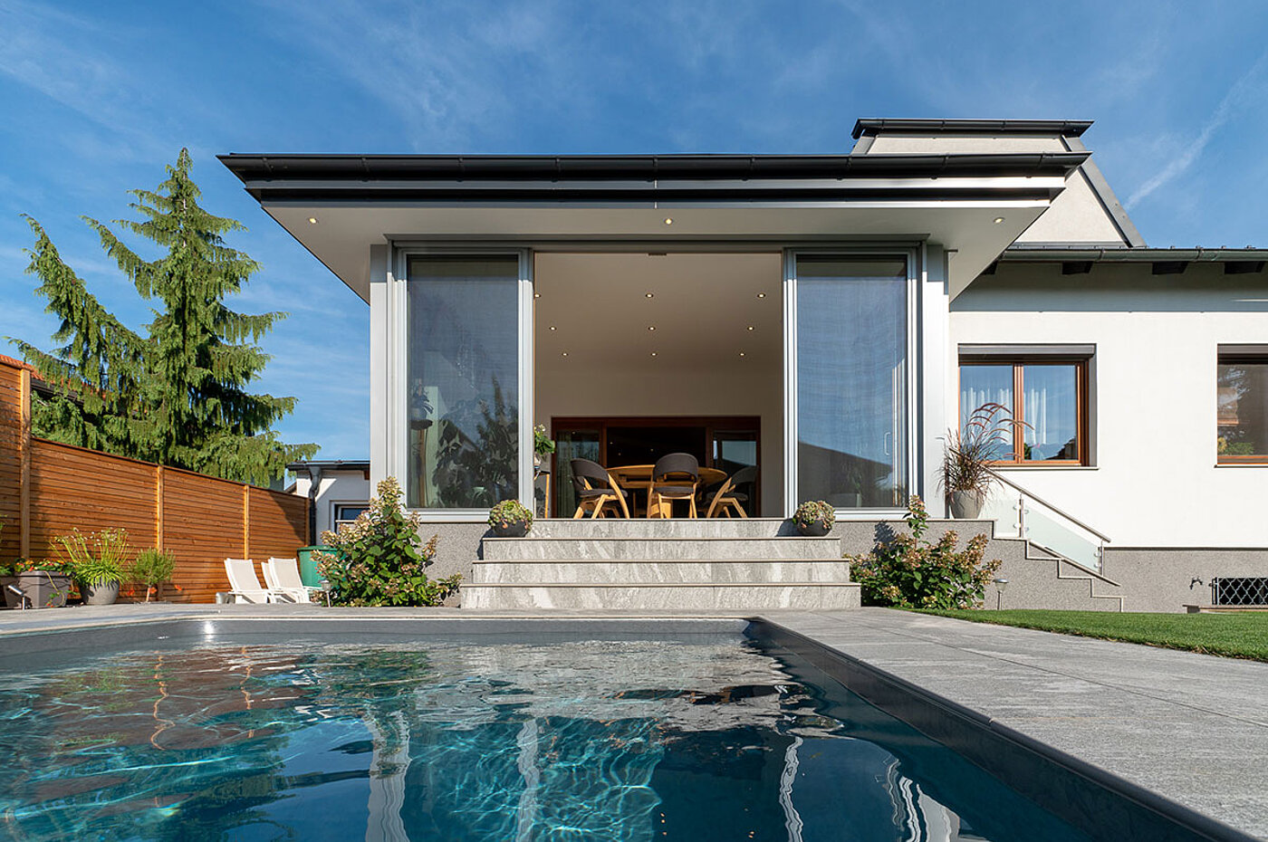 An ein Haus aus den 80-er Jahren wurde die bestehende Terrasse mit einem modernen Wintergarten mit Flachdach aufgewertet. Der mit raumhohen, zweiflügeligen Schiebetüren ausgestattete Wohnbereich sorgt mit dem direkten Zugang zum ebenfalls neu geschaffenen Swimmingpool für eine deutliche Steigerung des Lifestyles.
