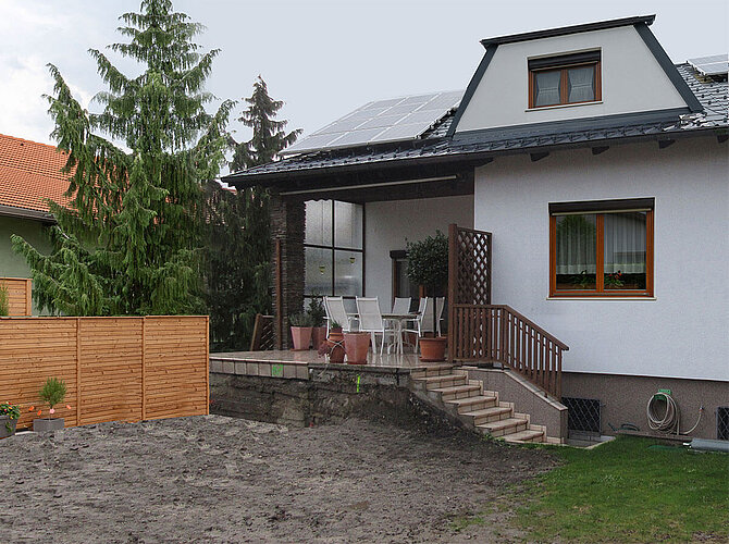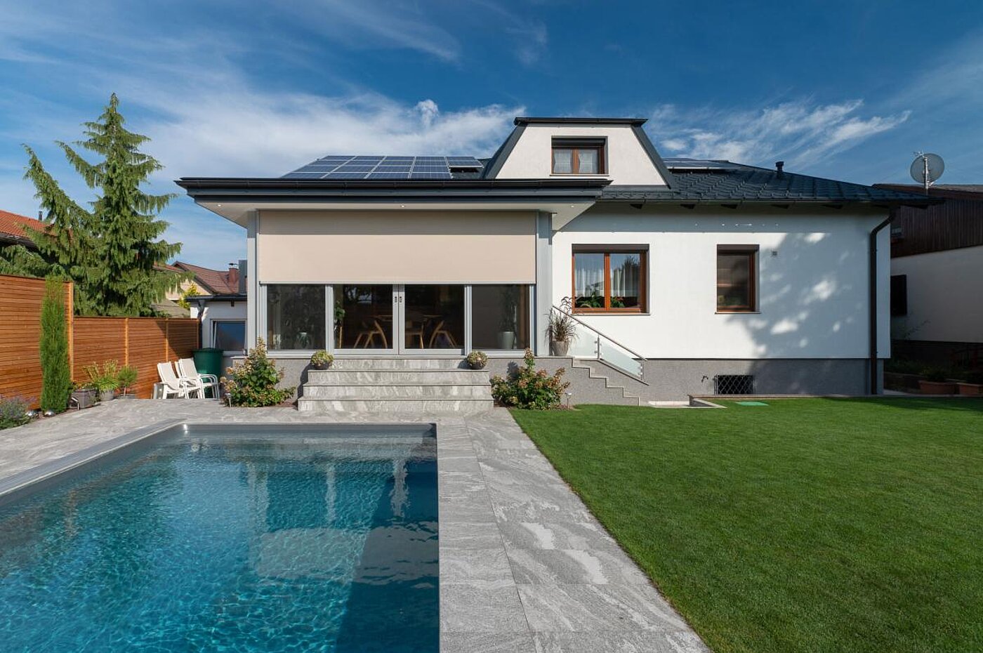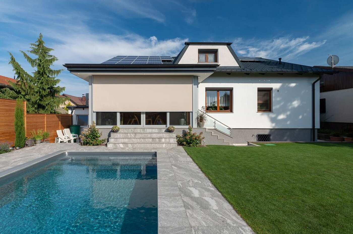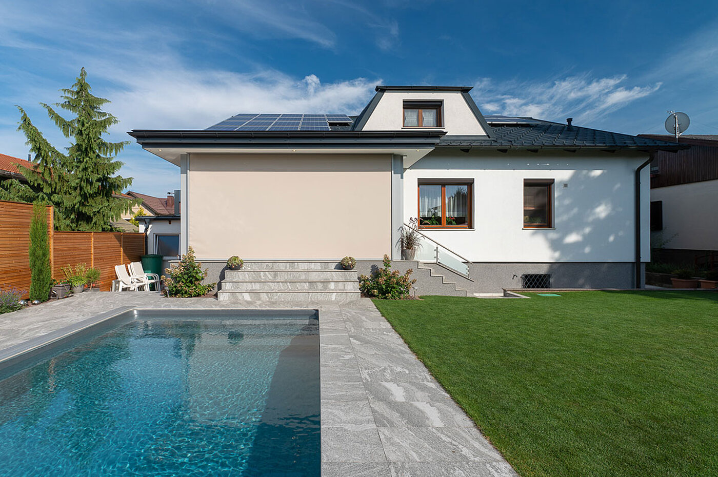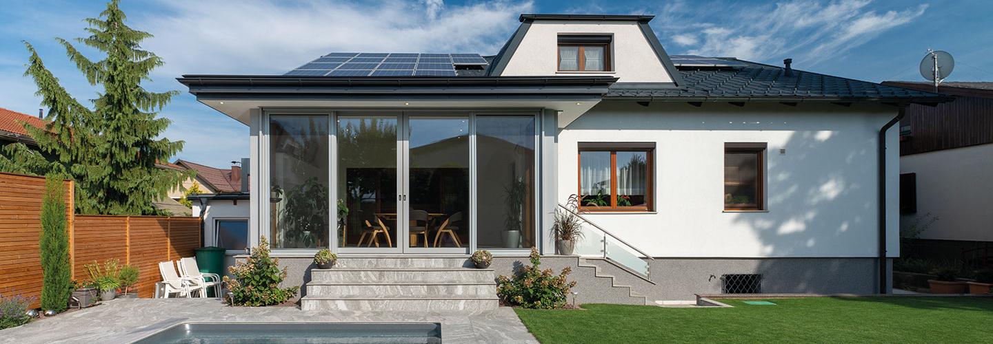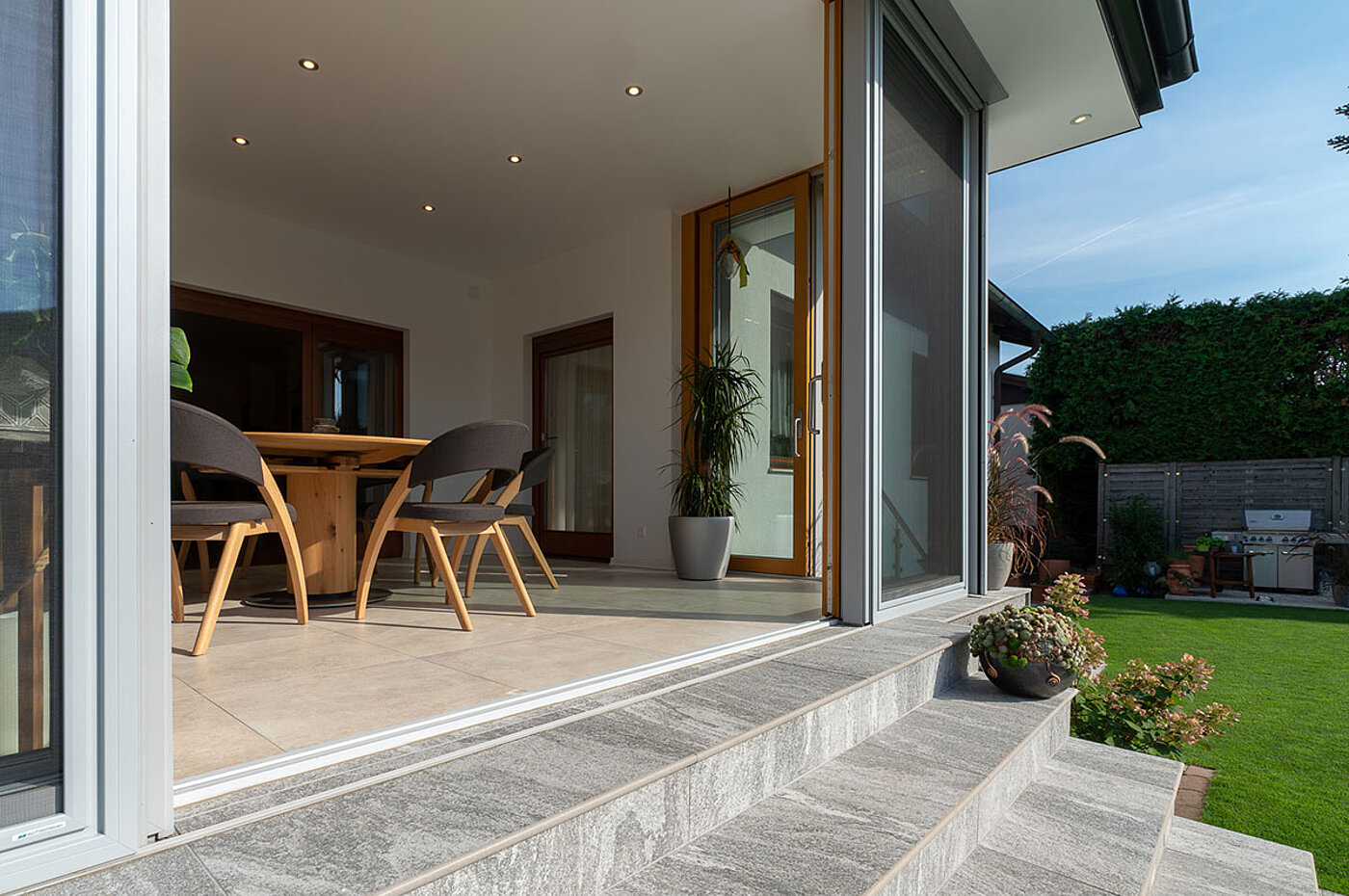 An ein Haus aus den 80-er Jahren wurde die bestehende Terrasse mit einem modernen Wintergarten mit Flachdach aufgewertet. Der mit raumhohen, zweiflügeligen Schiebetüren ausgestattete Wohnbereich sorgt mit dem direkten Zugang zum ebenfalls neu geschaffenen Swimmingpool für eine deutliche Steigerung des Lifestyles.