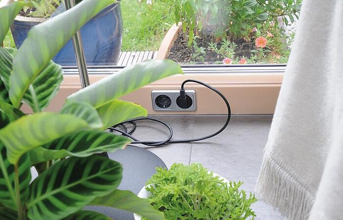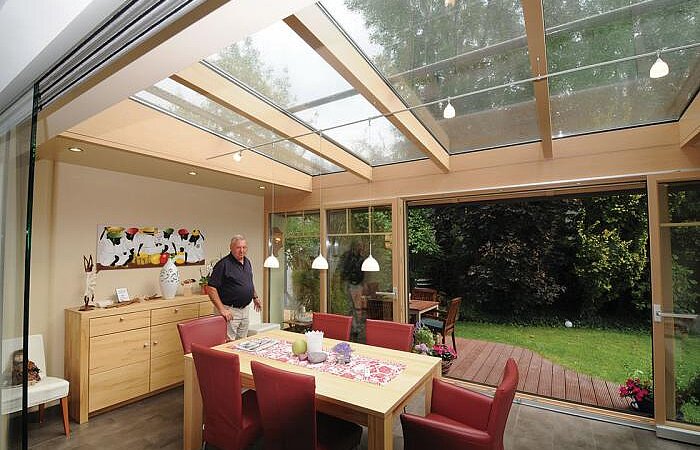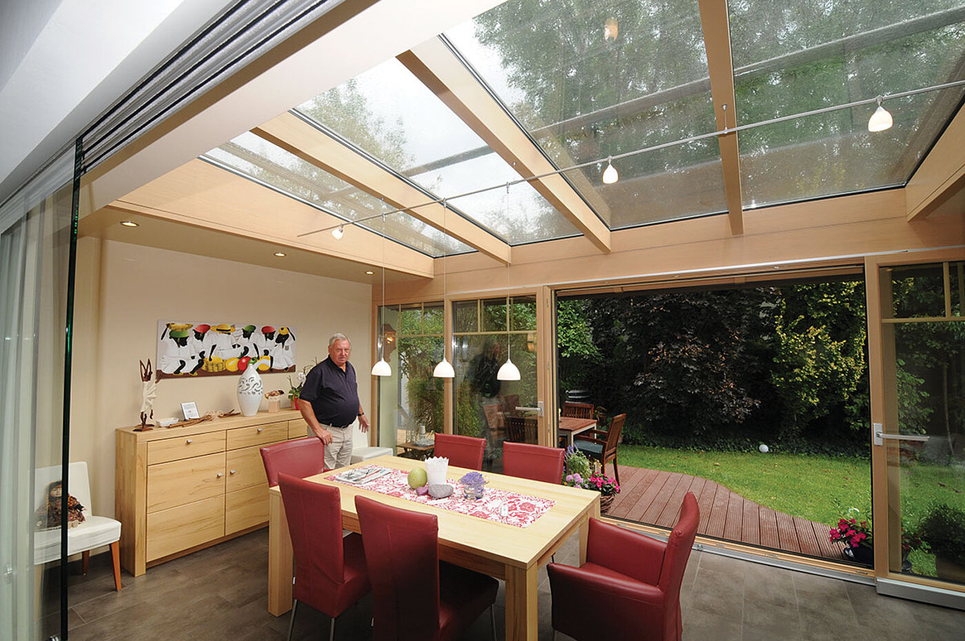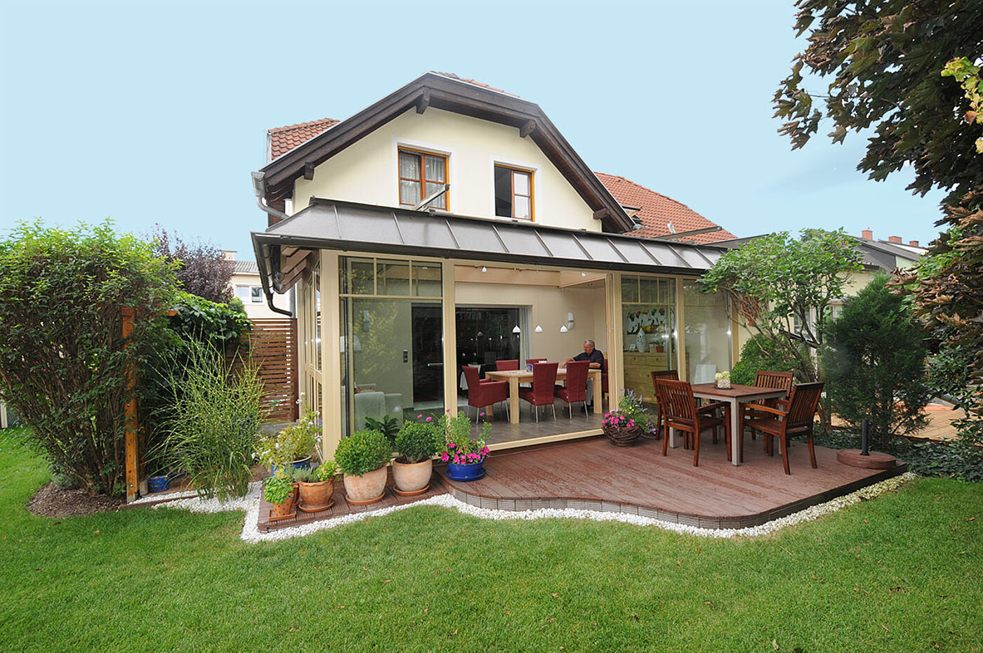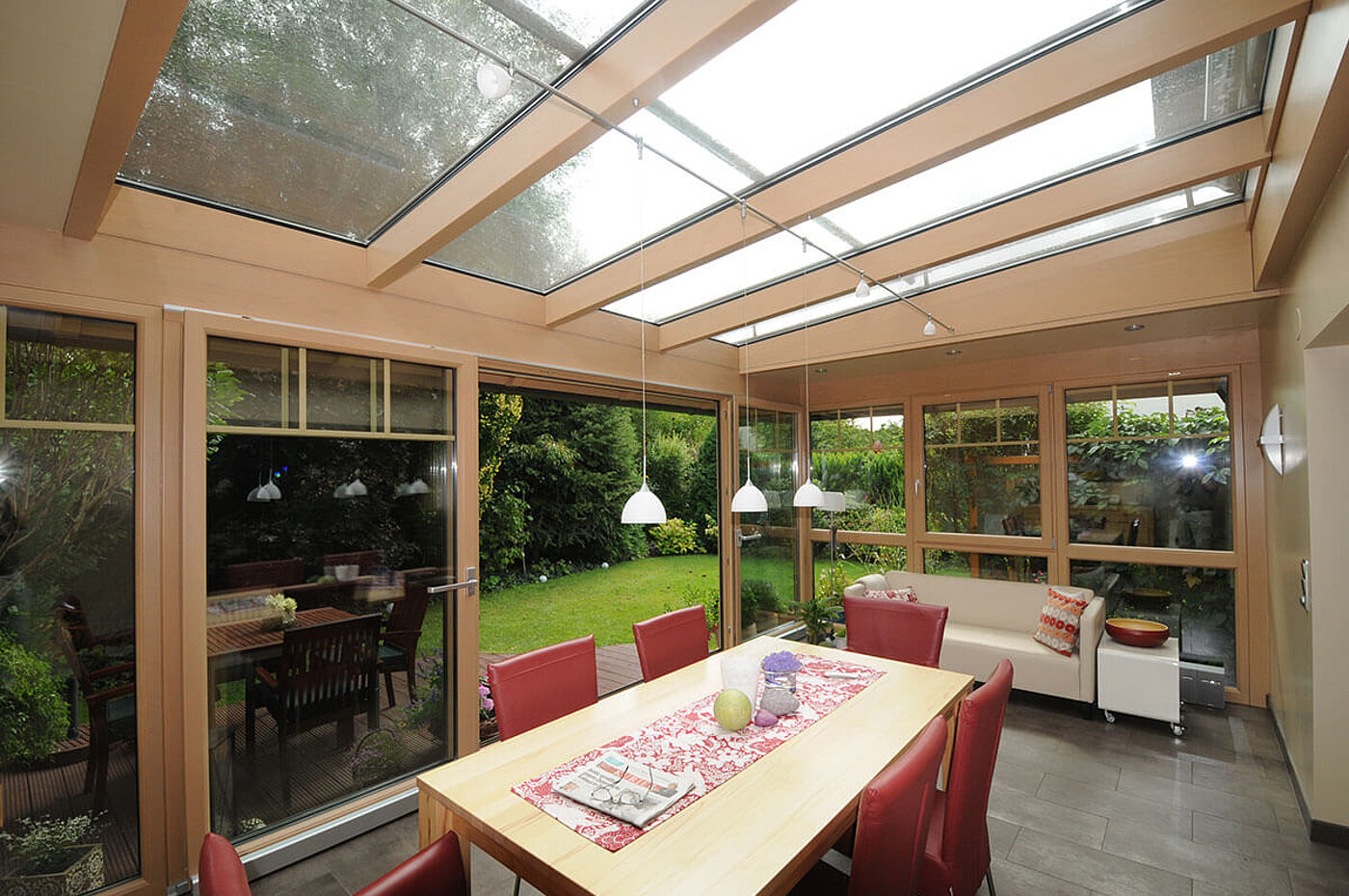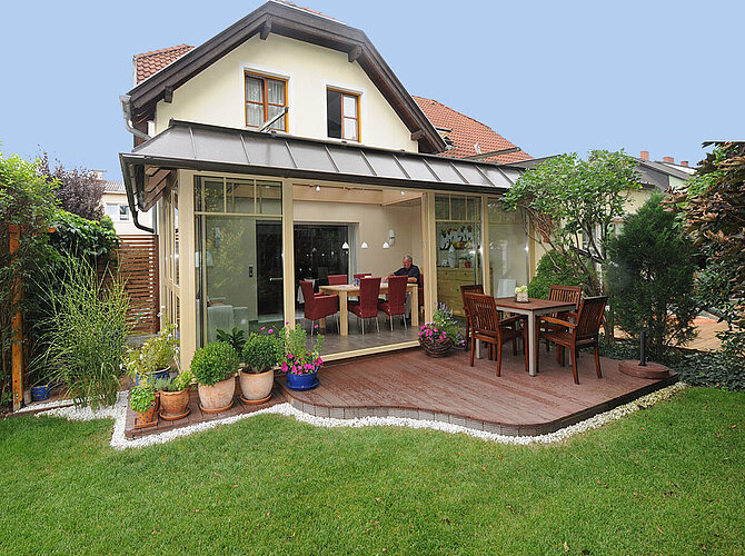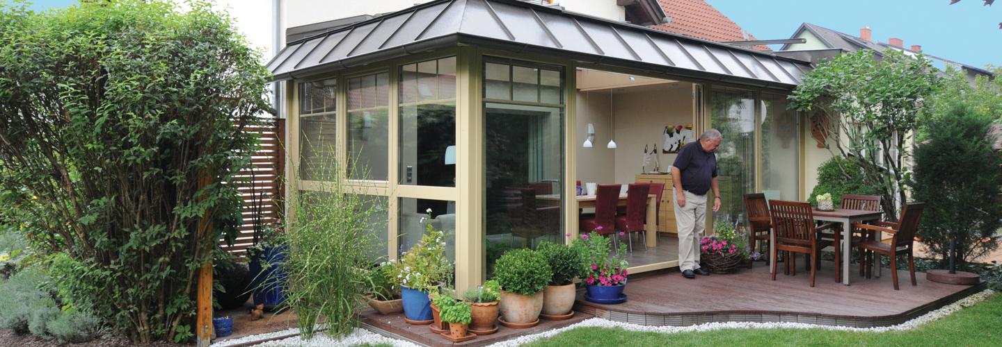 Das dunkelbraune Walmdach aus pulverbeschichtetem Aluminium ist dekorativ und schützt. In Kombination mit dem beigen Wintergarten ergibt sich eine heimelige Atmosphäre.