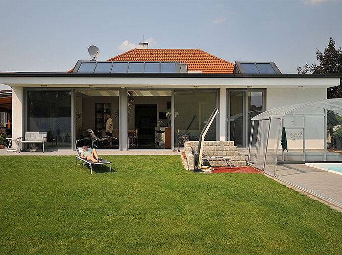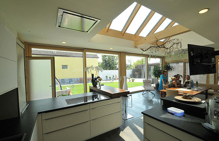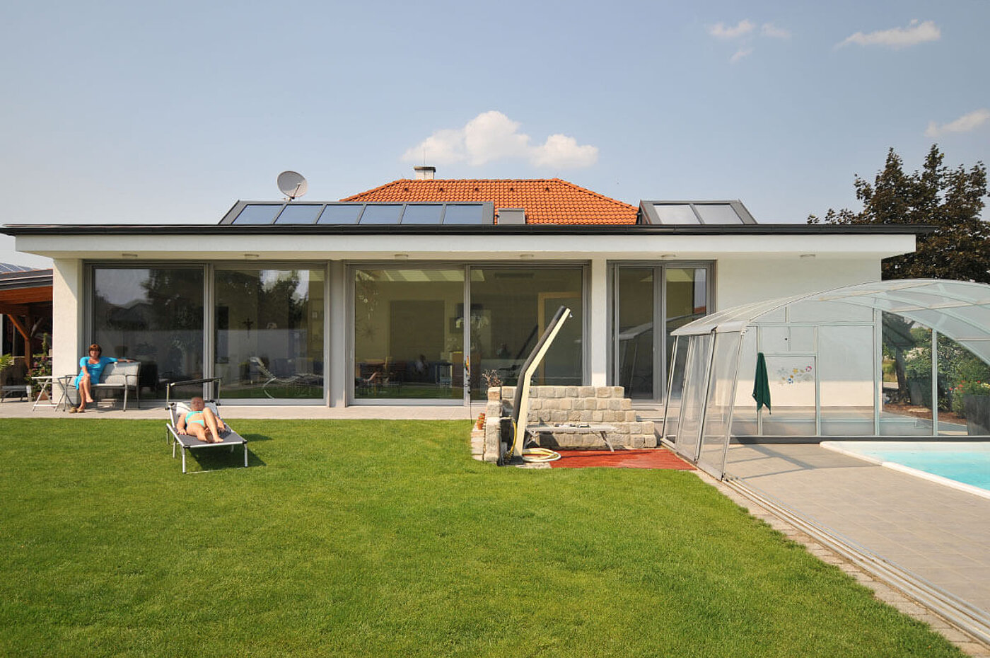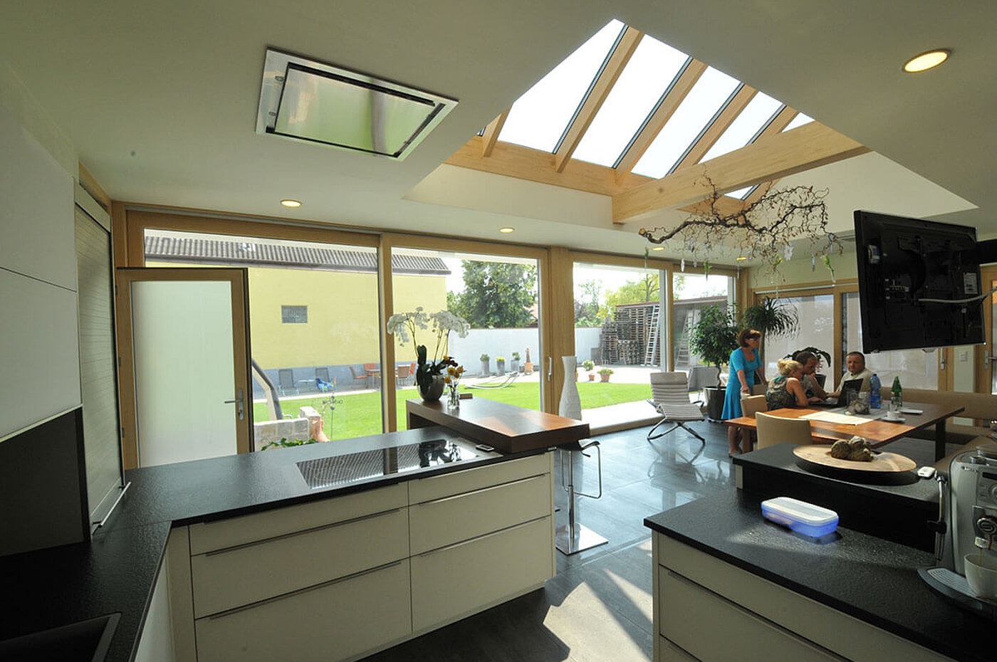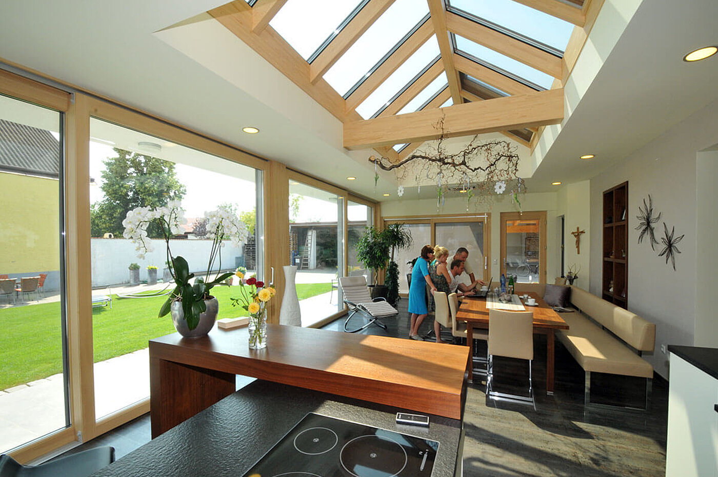 Klare Formen und verputzte Ecksäulen sind Markenzeichen unseres modernen Wintergartens. In den Wintergarten integriert sind Küche, Essplatz und ein anschließender Fittnessraum