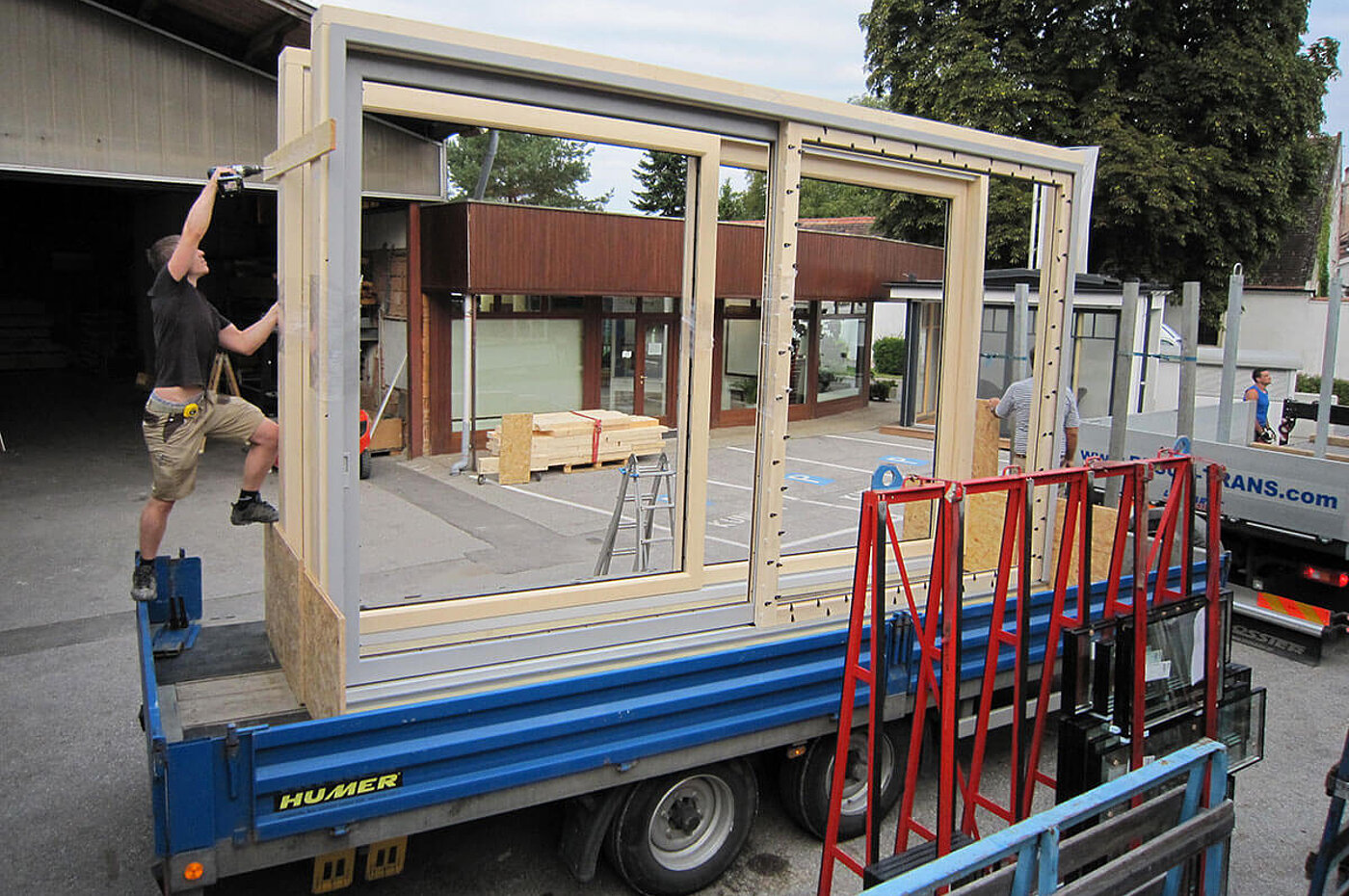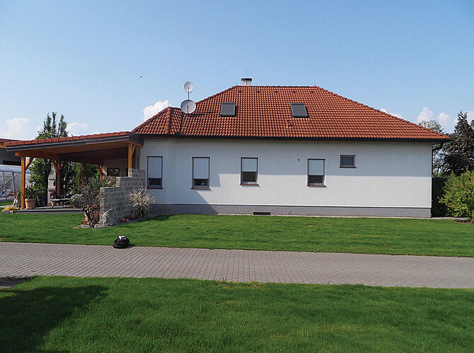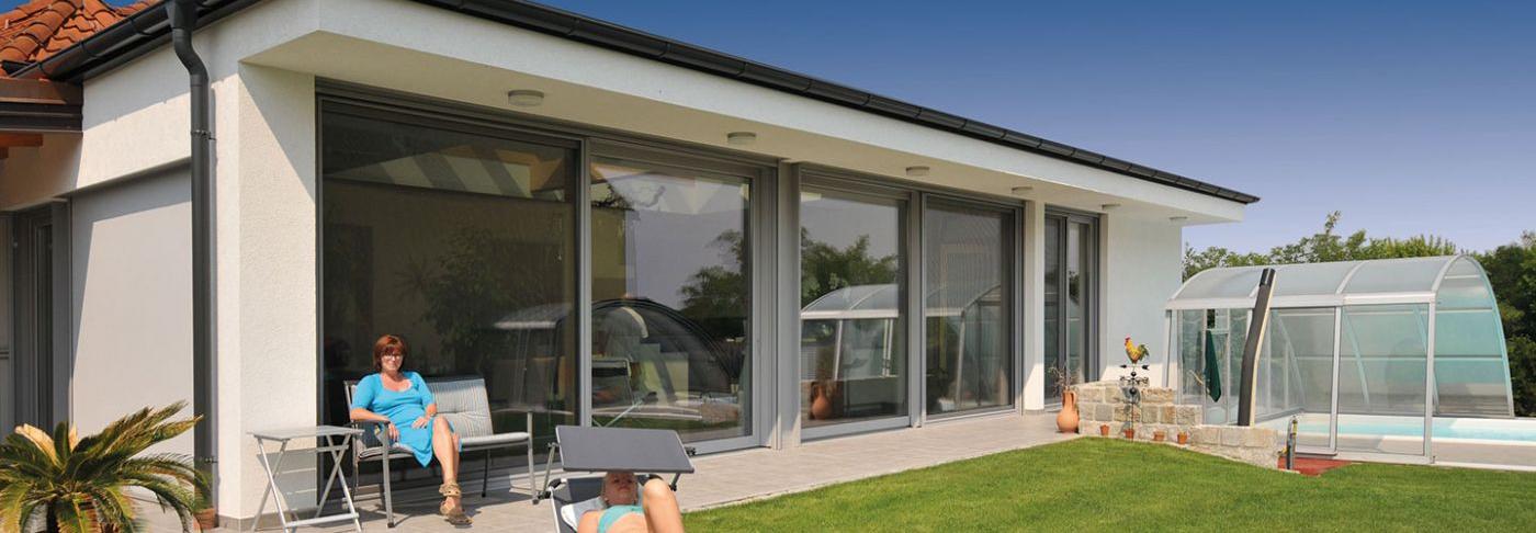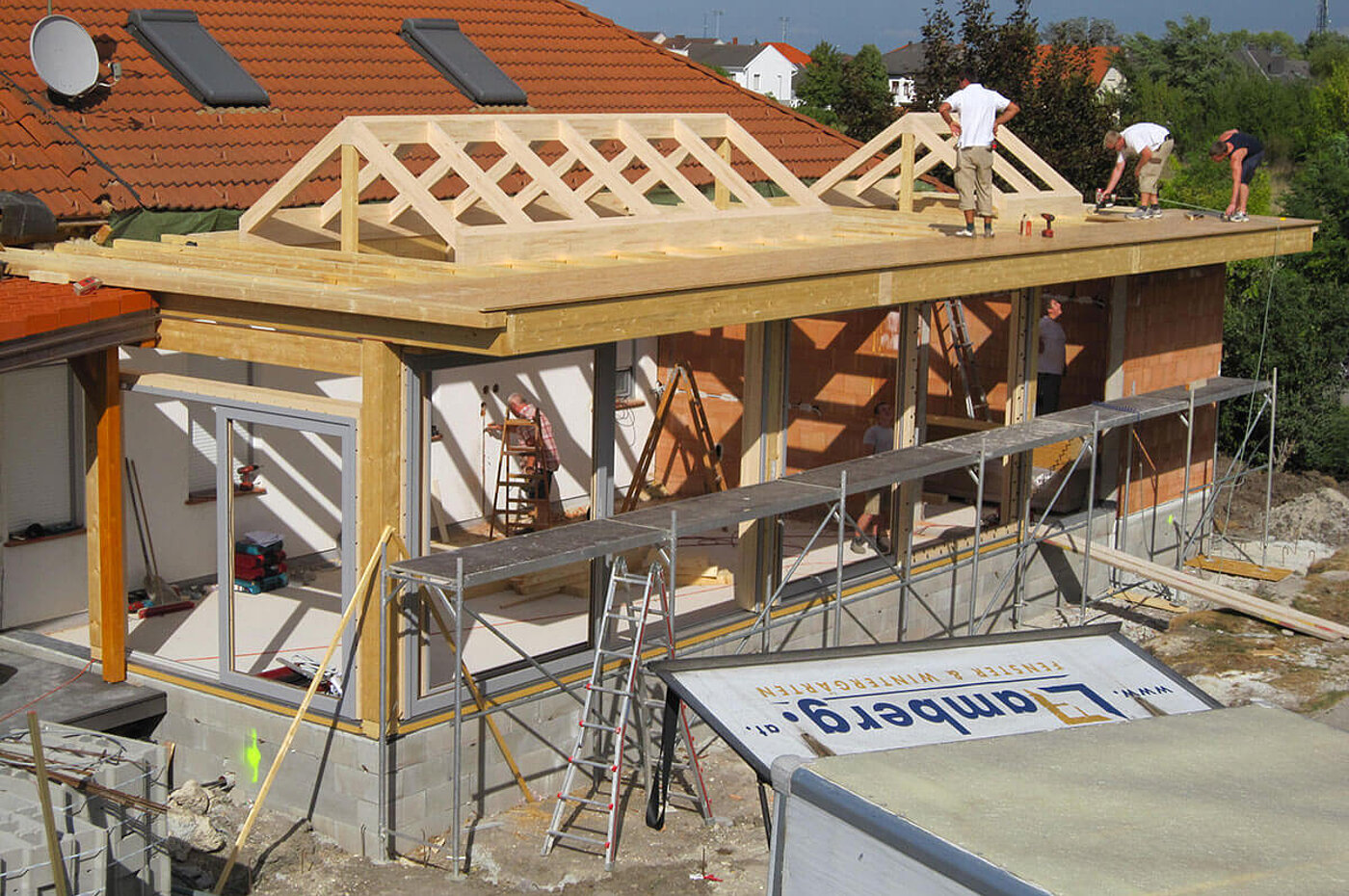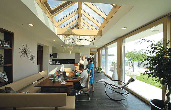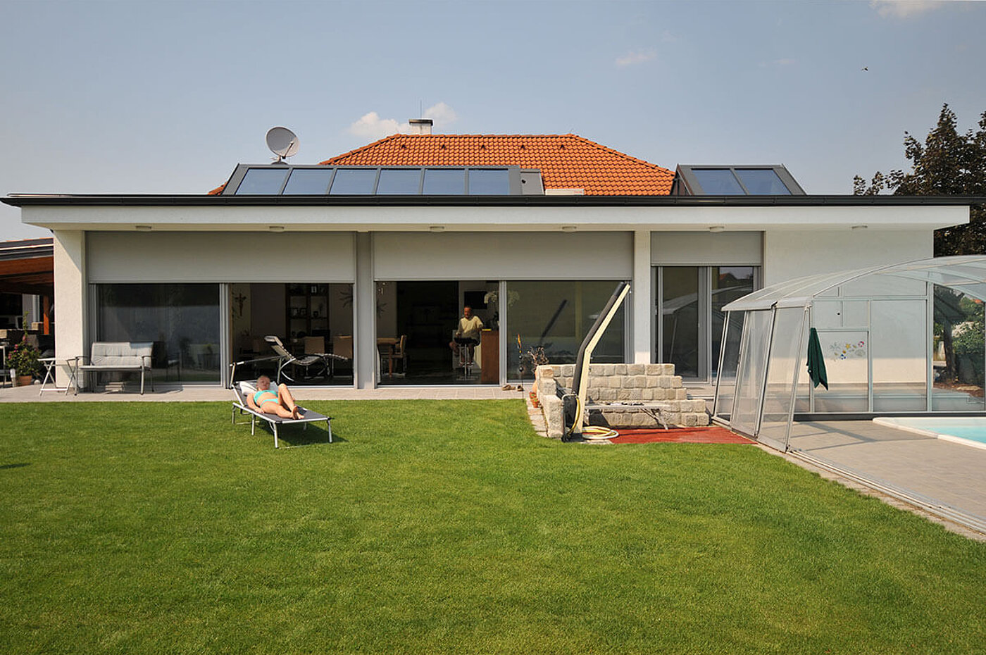 Klare Formen und verputzte Ecksäulen sind Markenzeichen unseres modernen Wintergartens. In den Wintergarten integriert sind Küche, Essplatz und ein anschließender Fittnessraum